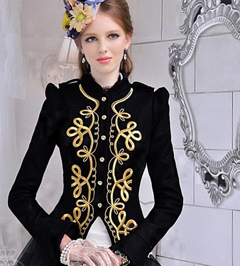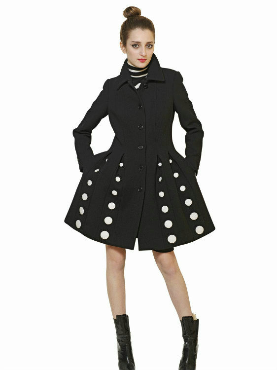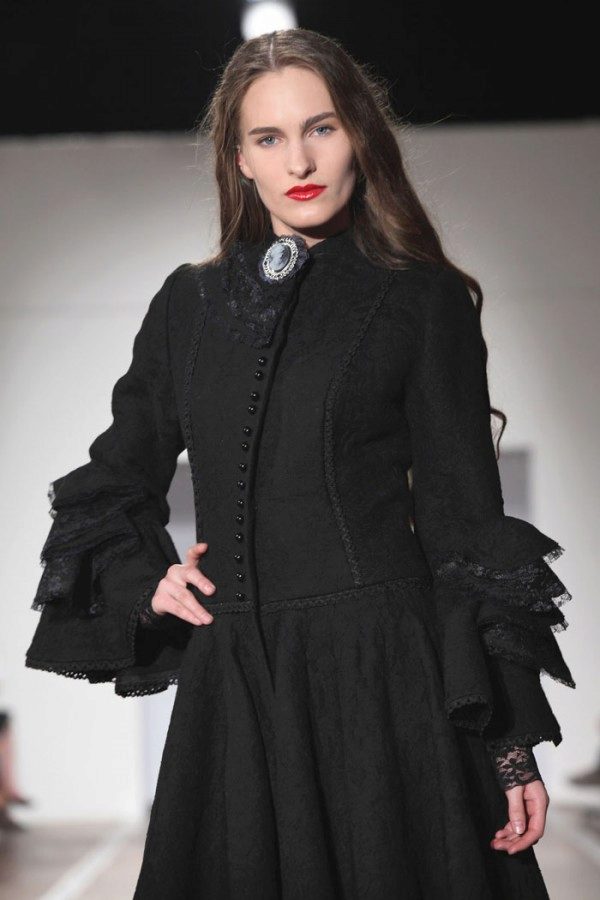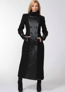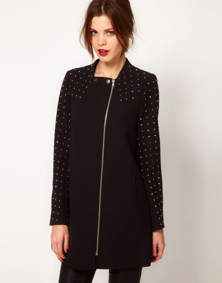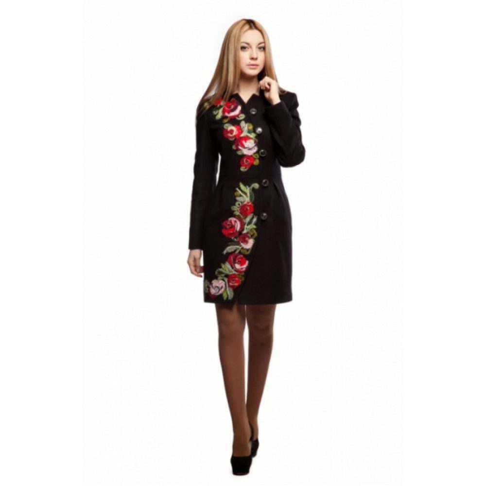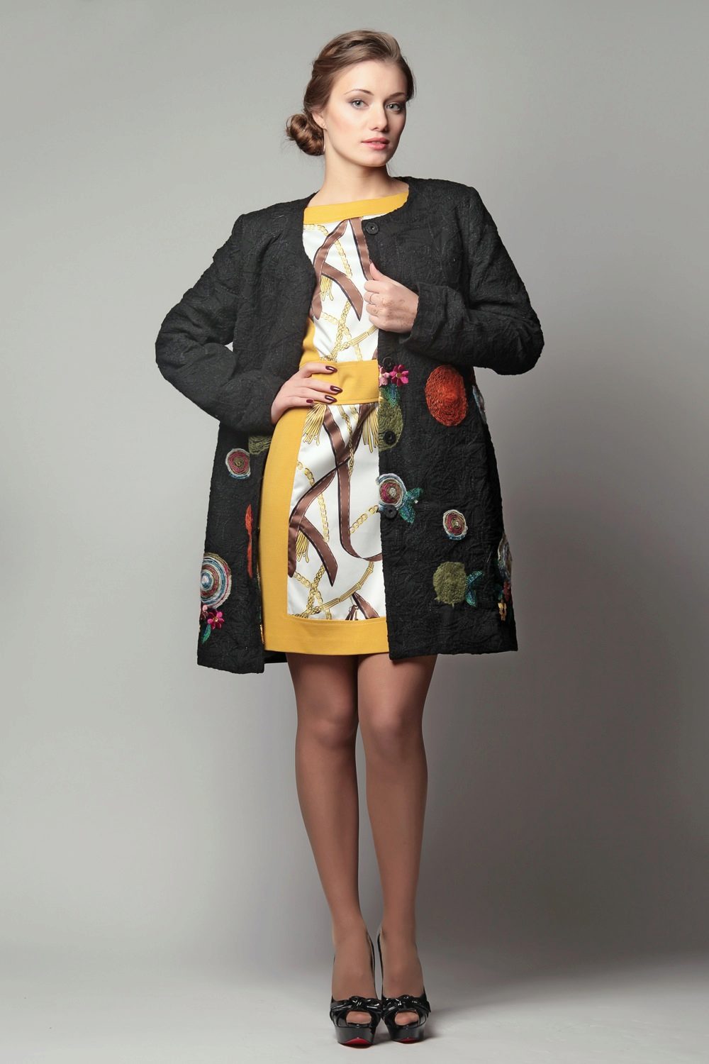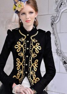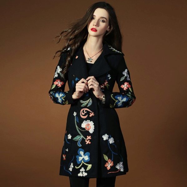 The black coat is a fairly classic strict version of outerwear, but there are many products with bright and attractive decor. Sewn to individual parts (lapels, cuffs, pockets) pebbles, beads, buttons, large rhinestones can become jewelry. Embroidery and appliqué allows you to lay out an interesting pattern or pattern. Inserts and sewn lace details are used.