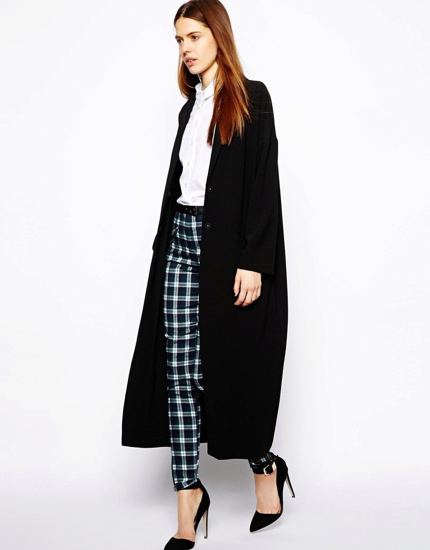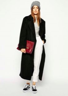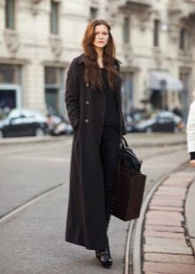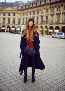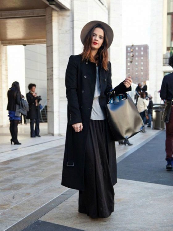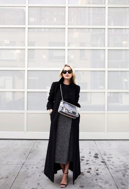 - Maxi coat with a long skirt - the standard of femininity and elegance.To top it off shoes or sandals with heels and an original bag over the shoulder.