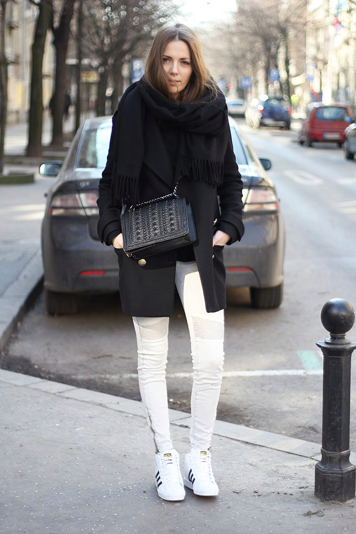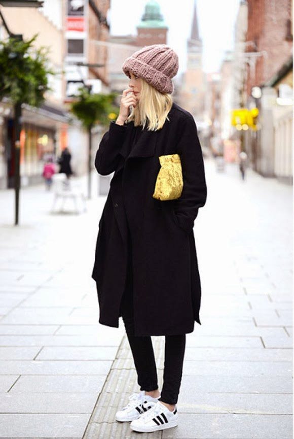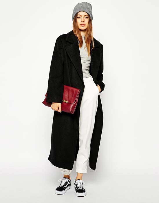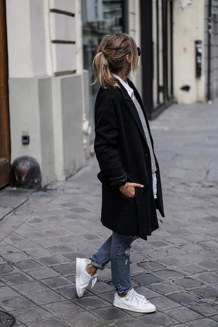 Depending on the length of the coat and the overall style, you can choose shoes with heels or platform, with a flat sole - shoes, boots, boots. With short models combined boots. Even sneakers, sneakers, sneakers are suitable for some models that are more casual and casual. Shoes do not necessarily have to be just black, gray or brown, you can experiment with colors and finishes.