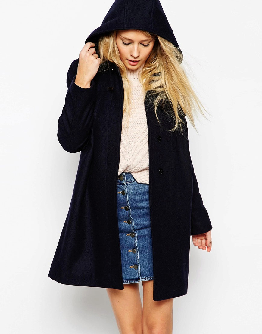 A coat with a hood perfectly protects from wind and weather, this is an excellent option for those who do not like to wear a hat. Also, it is necessary when you are going to an important event, and can not afford to spoil the hairstyle. Especially feminine look model with a fur trim on the hood.