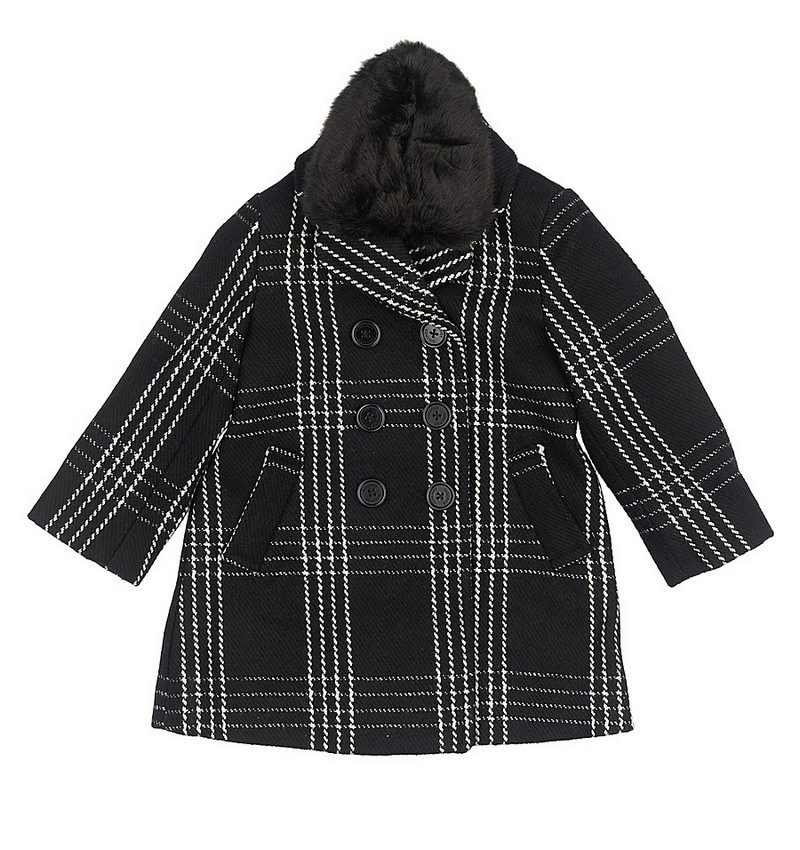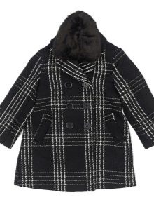 - Gulliver's black double breasted coat: stylish drawing in contrasting white cage, sleek cut, fur-lined collar, pocket pockets.