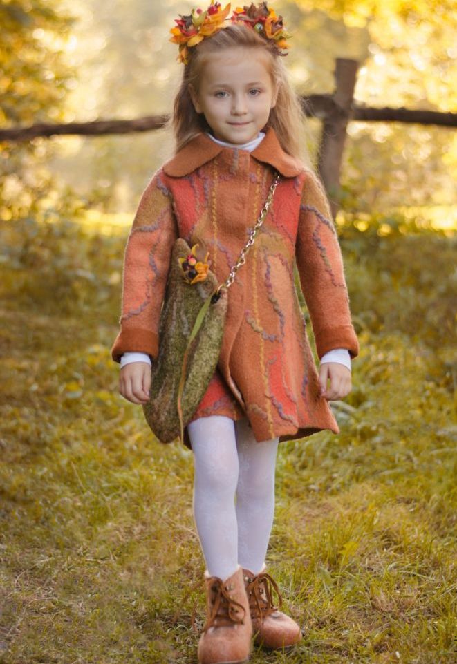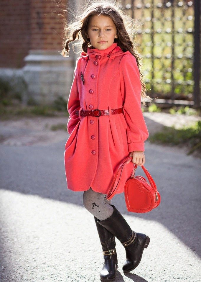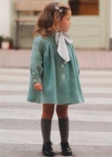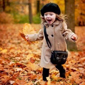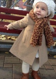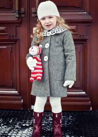 Graceful leather boots or boots can be worn on the feet (if the girl is already old enough, allow a low heel or wedge). In rainy weather, bright rubber boots and an umbrella to match the coat are perfect.