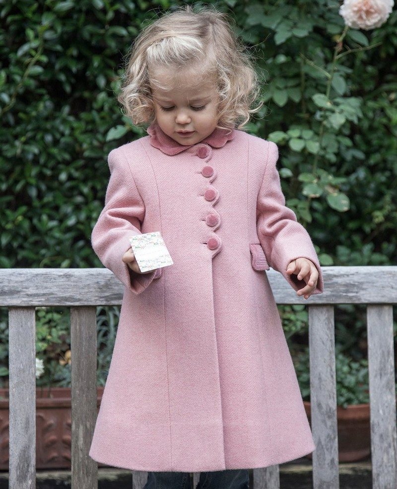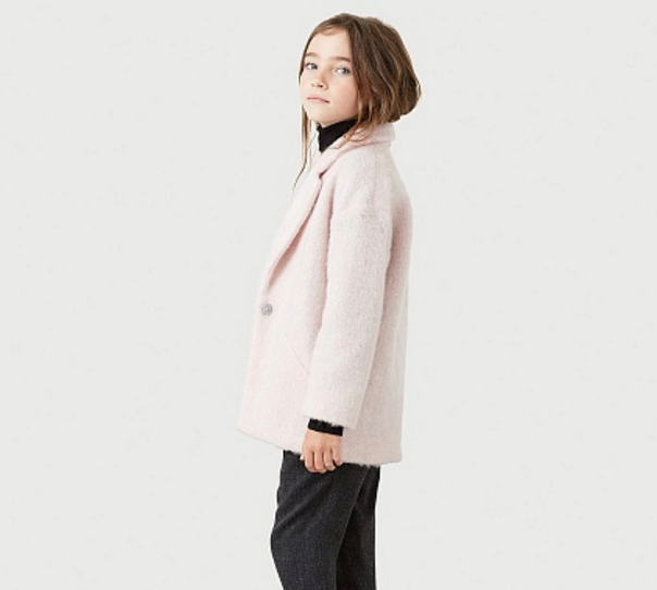- Mango kids' pale pink cropped coat: straight cut, turn-down collar, V-neckline, hidden buckle, welt pockets, wool with mohair.
