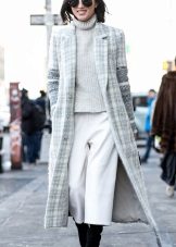 The image created from a combination of a light pink skirt just below the knee, black socks and light-colored sneakers with a thick sole, looks quite elegant, but very unusual. The highlight of the look is that both the top of the cappuccino hue and the long gray coat are made of the same wool fabric and differ only in color. Complementing the image of a white bag, as well as rolling up the sleeves, you can give a slightly sloppy, cheeky look alongside.