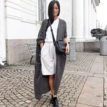 A knitted coat is also quite light, since even thick yarn will not protect against strong wind, but will be a wonderful addition to the image with a dress made of light, flowing fabric.