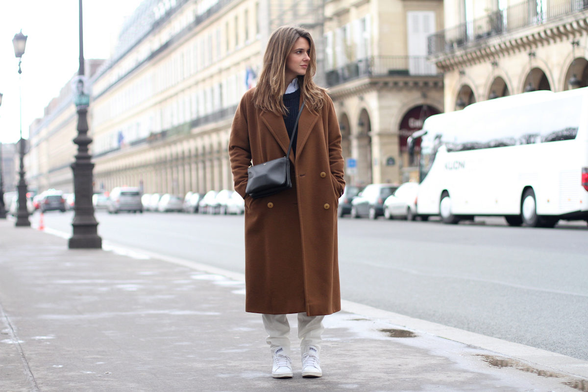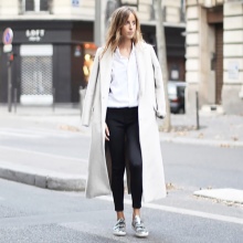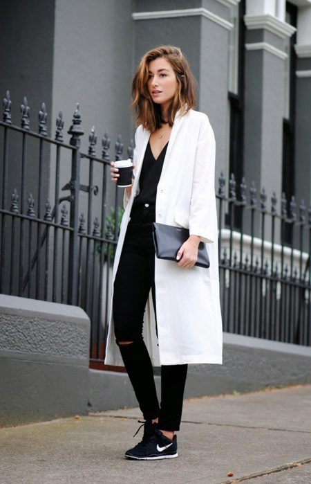 The image with light elements of sports style also looks quite impressive, and playing on contrasts makes the outfit a winning one. Black jeans with ripped knees, a black cashmere pullover, and a long white trench coat are a great choice for a weekend look. And small details such as black and white sneakers and a medium-sized black rectangular clutch will be a great addition.