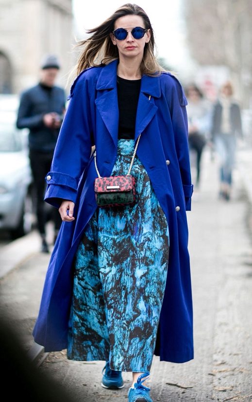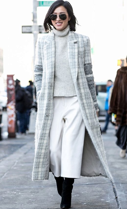 Skirts of various lengths, shorts, leggings and all kinds of tight-fitting trousers go well with a long coat.
