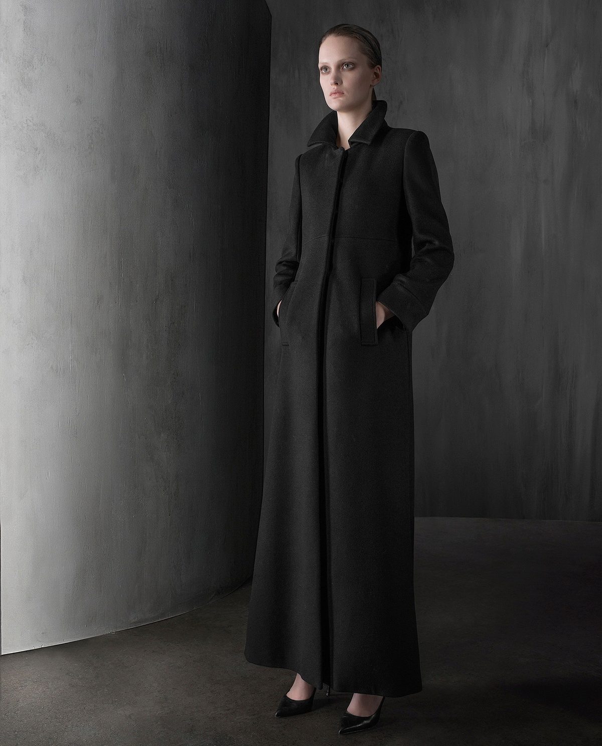 The cashmere coat looks luxurious and expensive, and the matte, smooth structure of the material is very soft and pleasant to the touch.