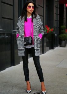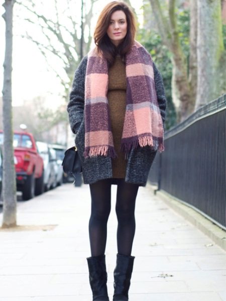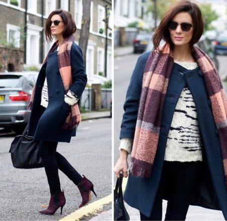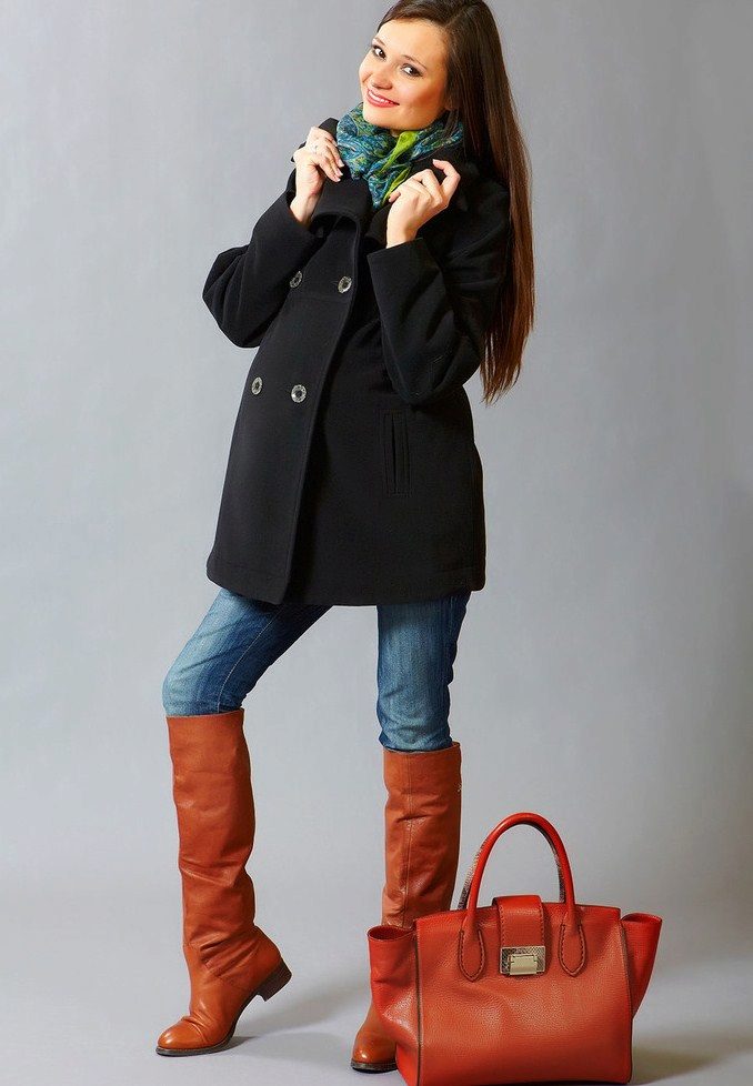 Depending on the style and model of the coat, the material from which it is sewn, and length, you can combine trousers, jeans, sarafans, dresses, overalls, tunics, turtlenecks, skirts, etc. As shoes, it is recommended to choose shoes or ankle boots on a flat sole or on a small heel.