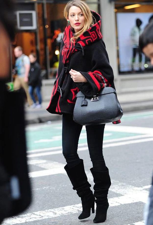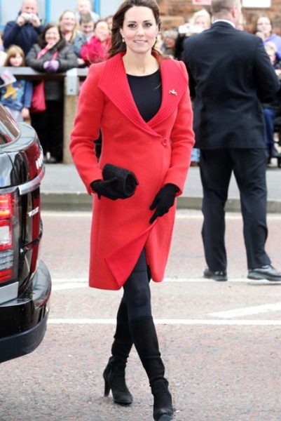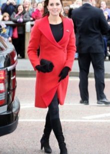A red coat of laconic cut with contrasting color fittings will be a highlight to create any image. Under this color is to choose clothes more restrained and dark tones.