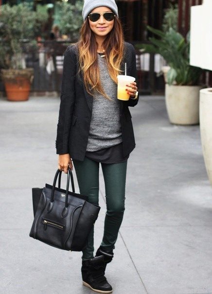 Bright, stylish bow harmoniously combines several shades of green at once. Bag, shoes and coats look great on a background of black clothes.