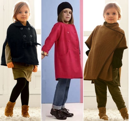 Baby duffles, coats, knitted coats - all of them are not rarely found on store shelves. You can find capes and coats, although they are not as widespread as other models, because of the lack of clasps, they are less protected from the cold.