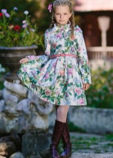 - If the daughter is going to a solemn event, it is necessary to give preference to a beautiful dress to the knee. For this case, it is better to have a coat on the exit of a bright color, which can be worn with high boots and fishnet tights. A beautiful bezel with a bow and a small handbag will complement the look.