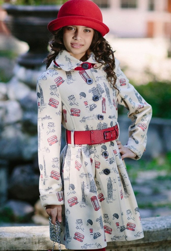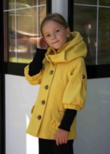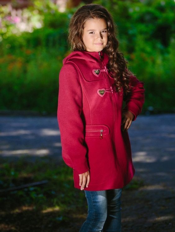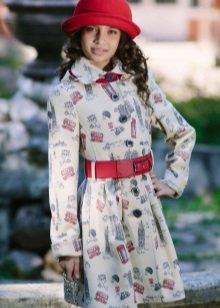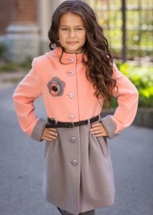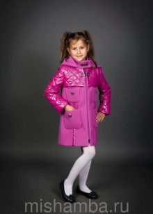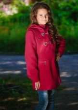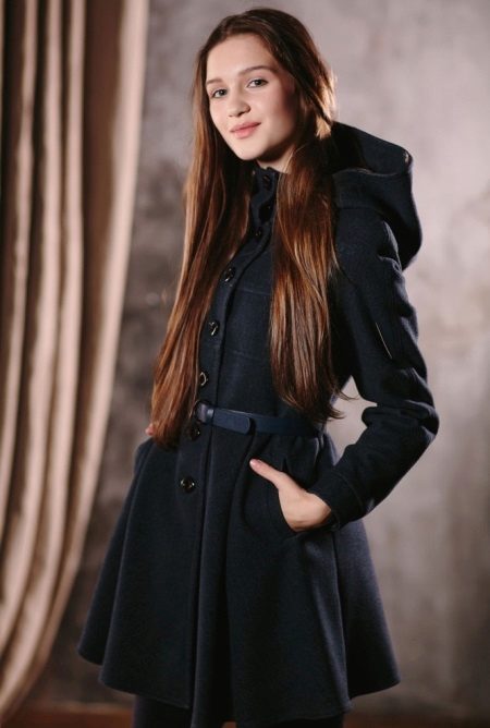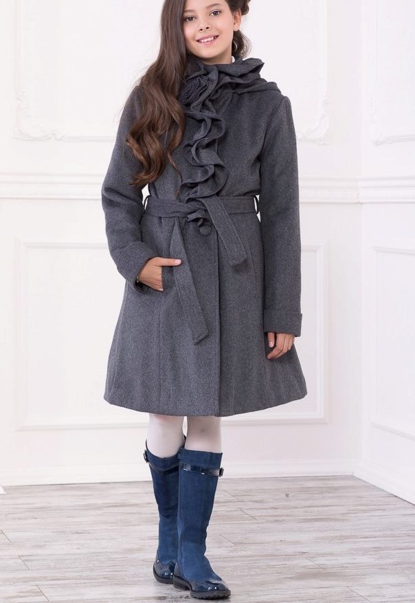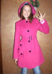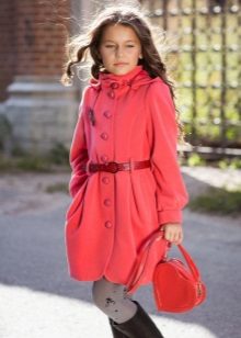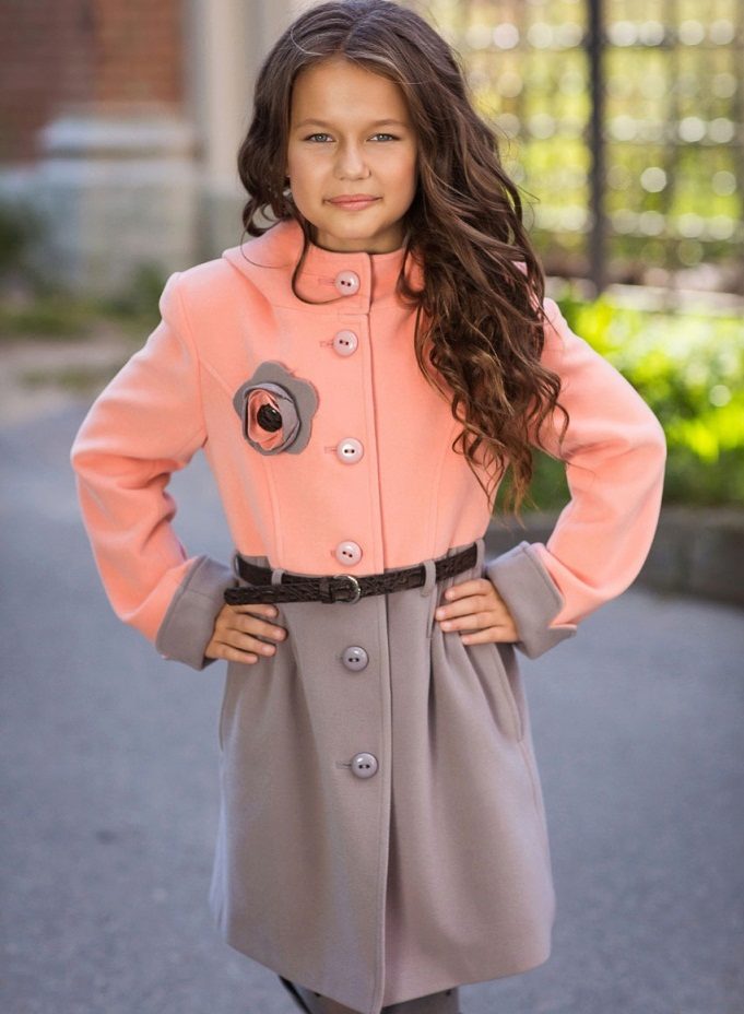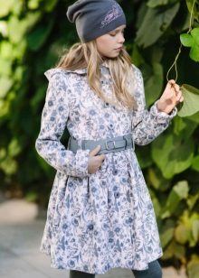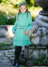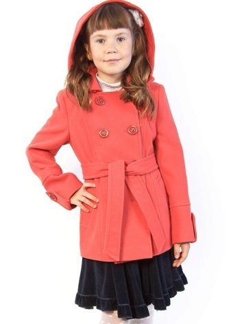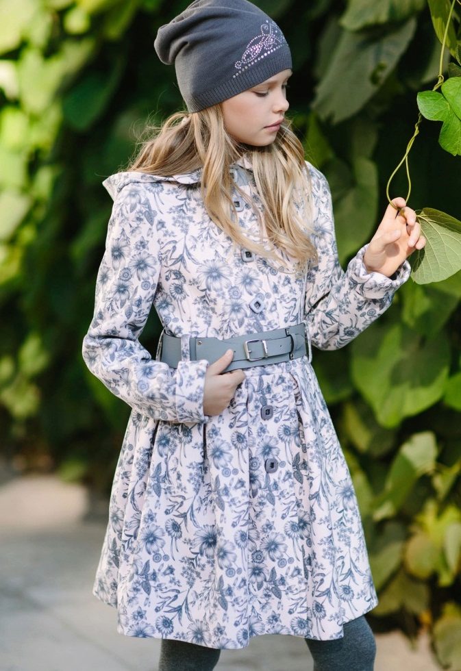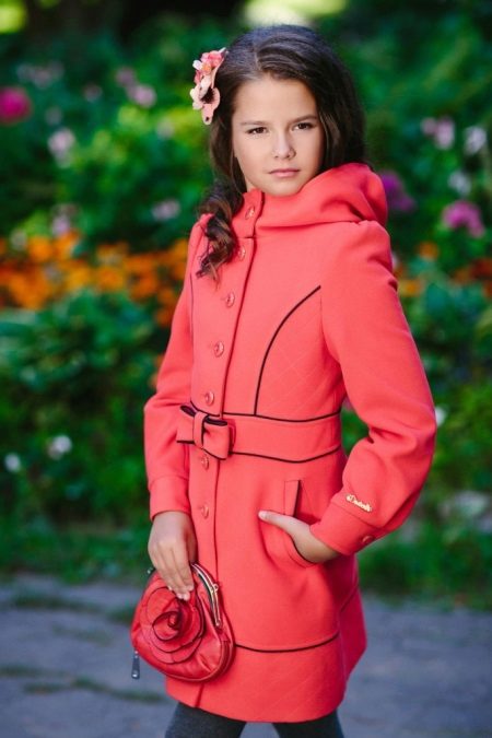 One of the most popular styles of girls' coats for the fall-spring season is a trapeze. Most often, this coat is complemented by a belt and hood. A variation of this style is the hourglass model.