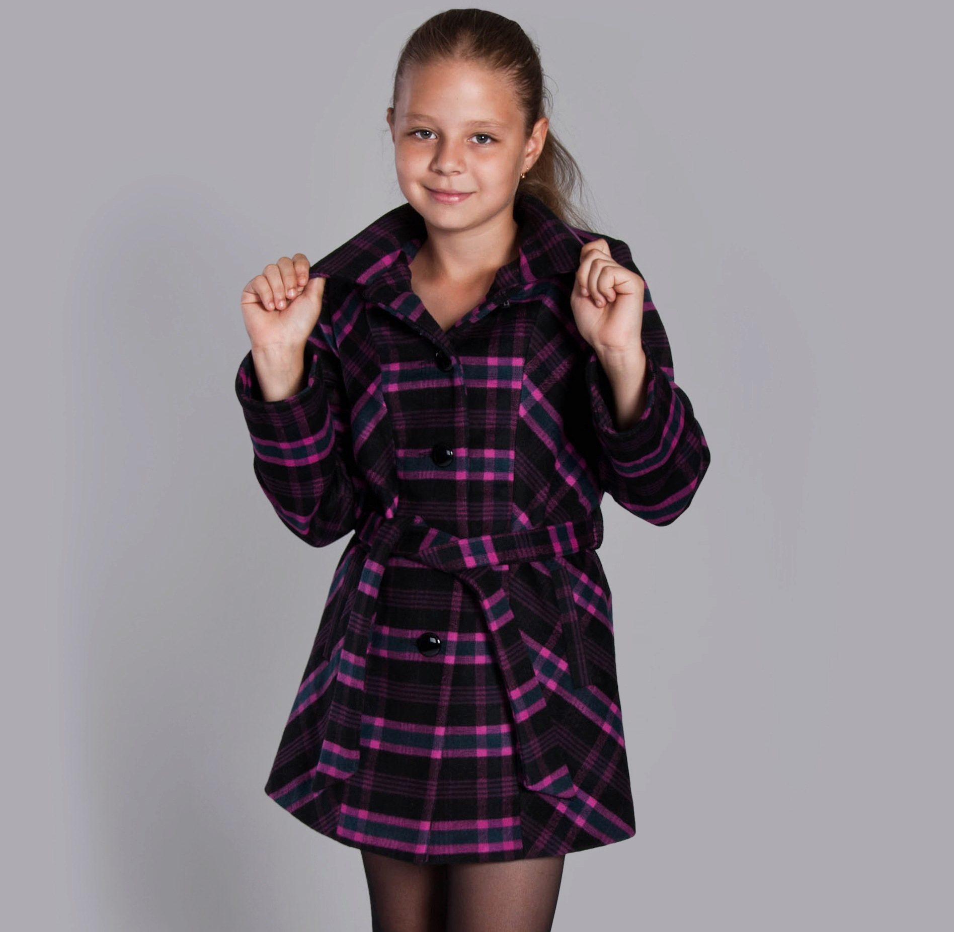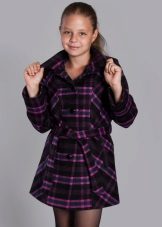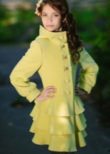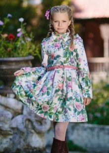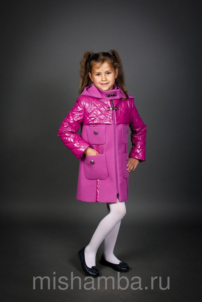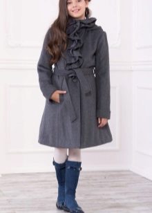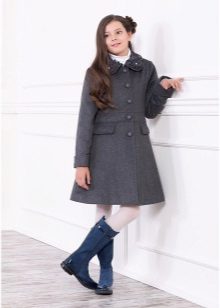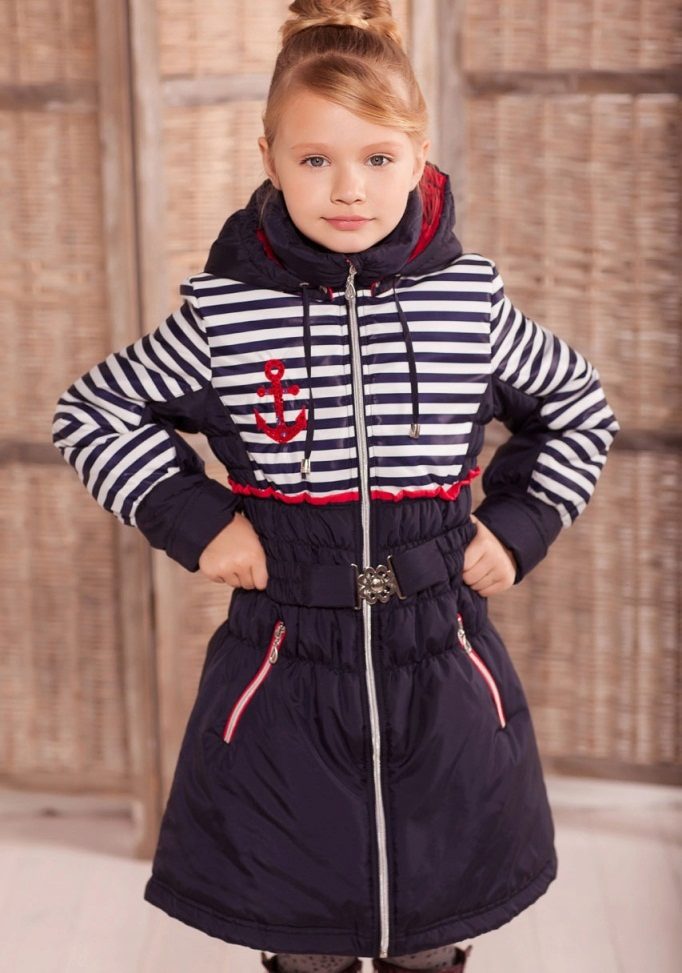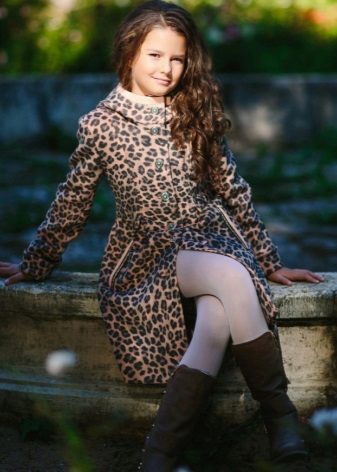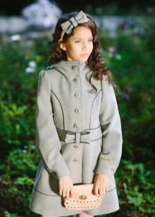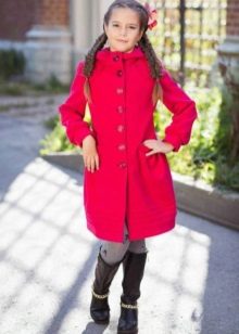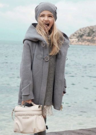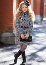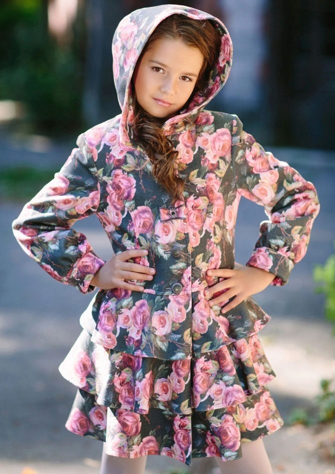 One of the most popular styles of girls' coats for the fall-spring season is a trapeze. Most often, this coat is complemented by a belt and hood. A variation of this style is the hourglass model.