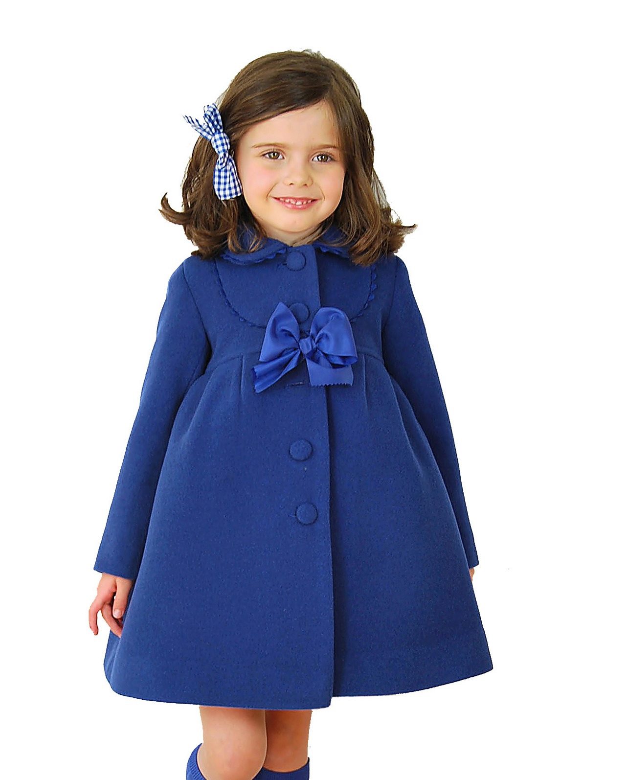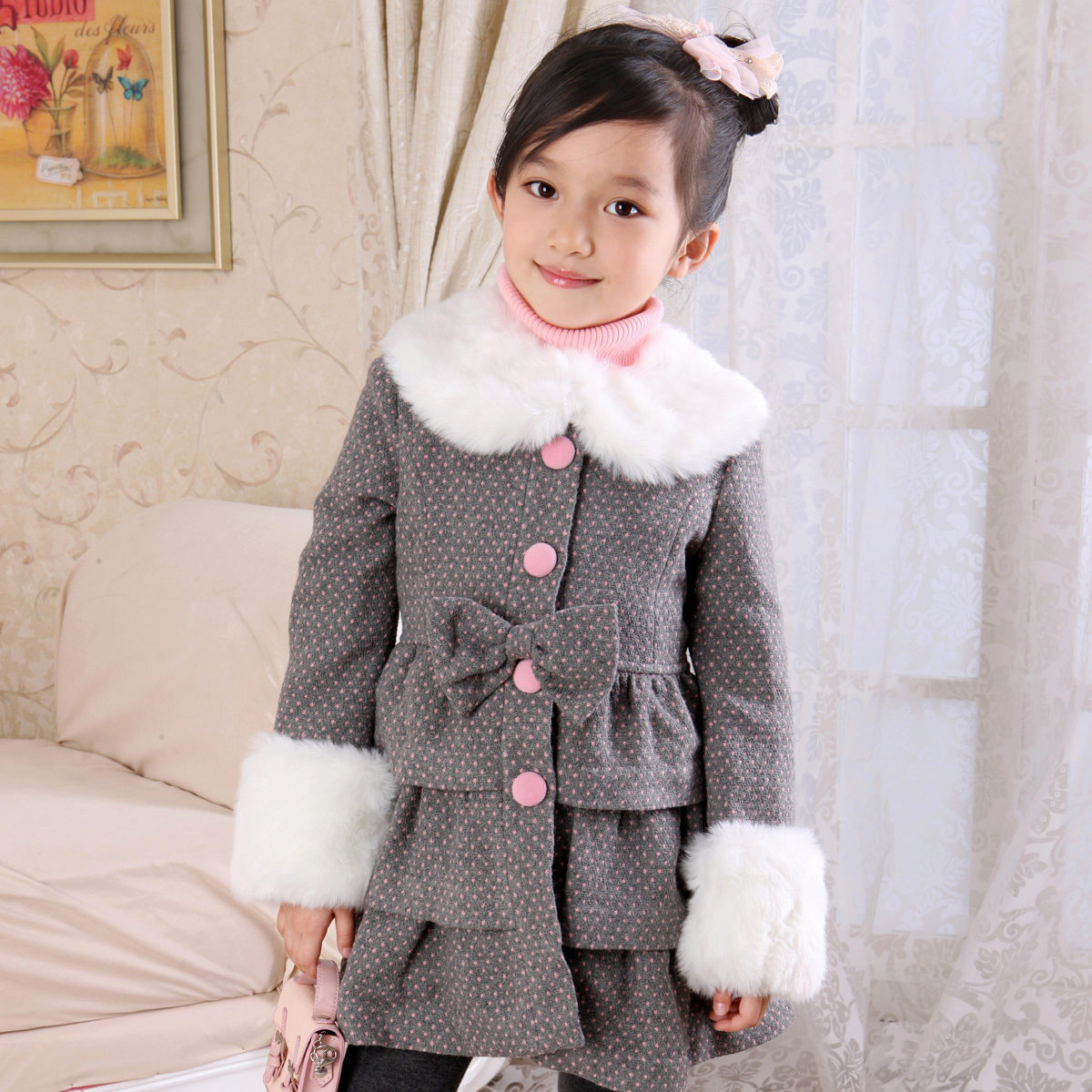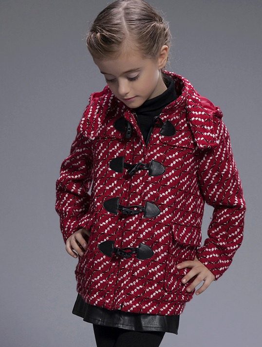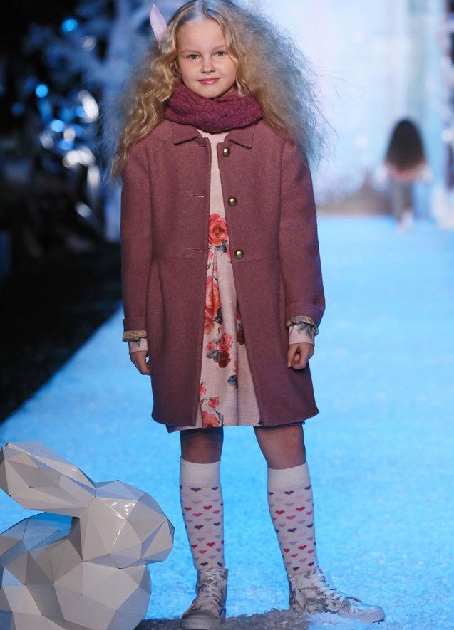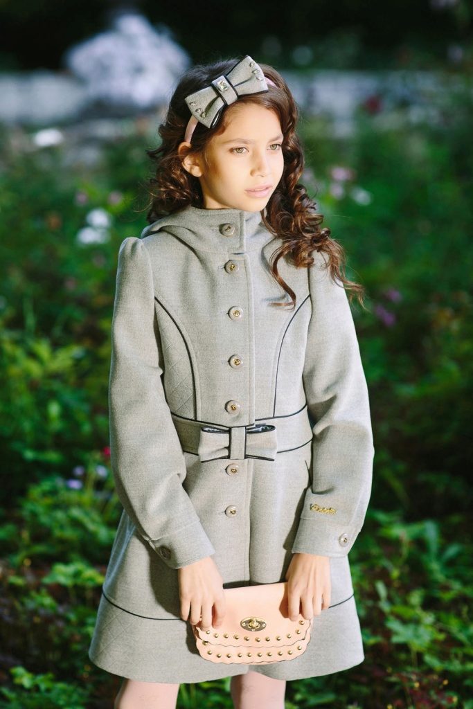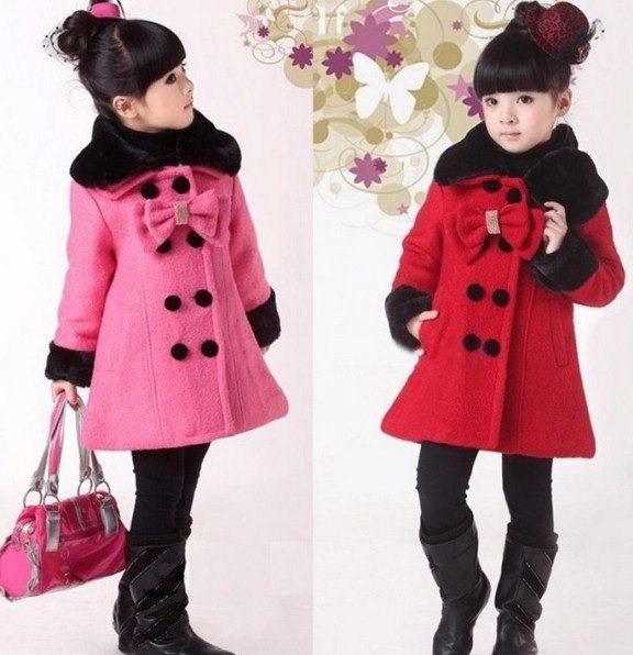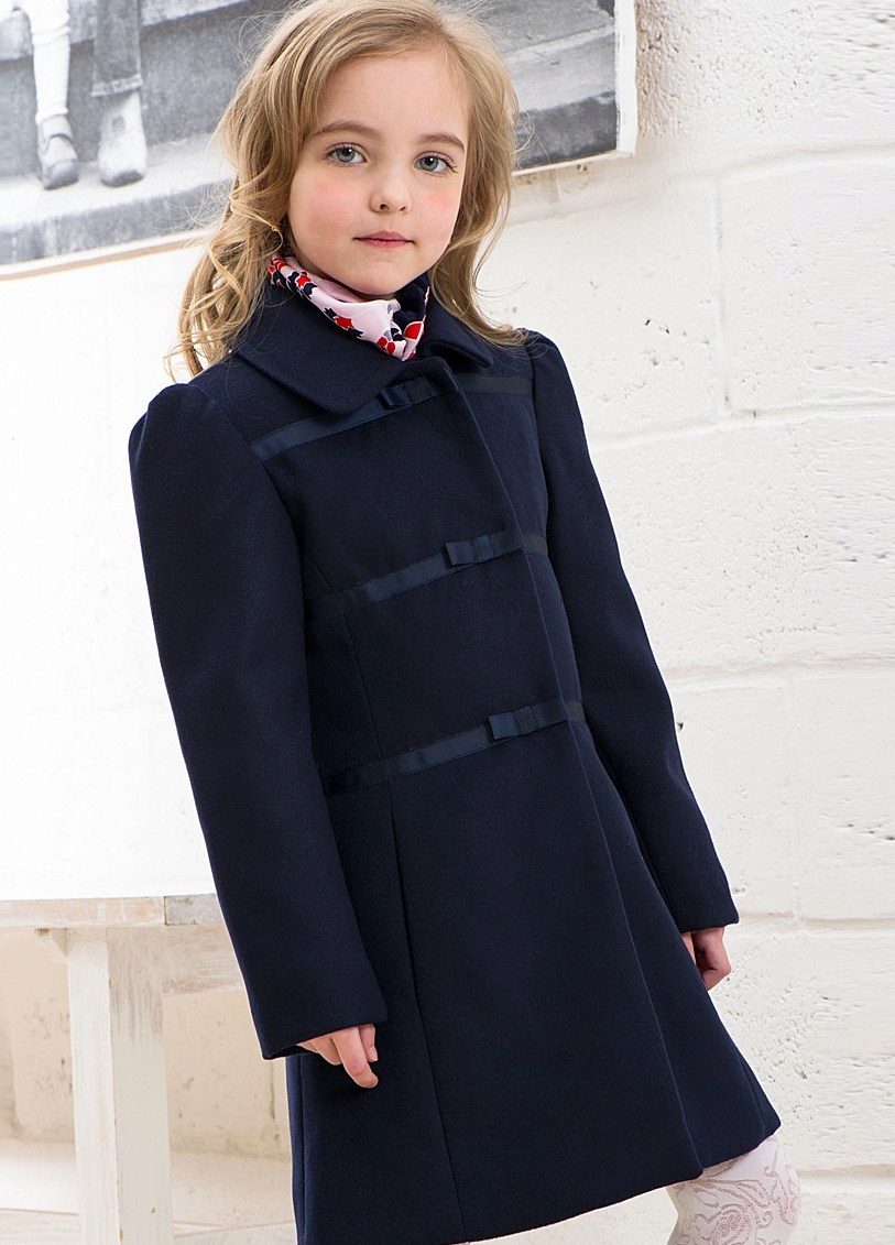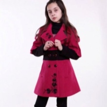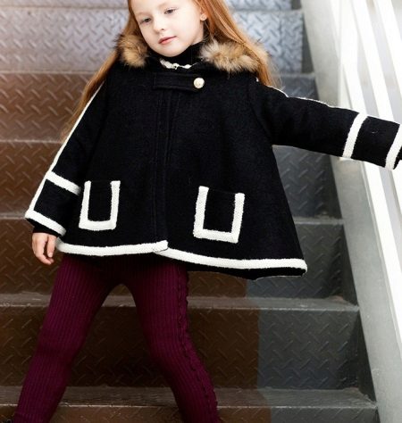 A bright A-silhouette coat in pink or red with contrasting black buttons and a fur trim on the collar and sleeves, as if specially made for a little princess. A large, beautiful bow is used as a decorative element. In such a dress young fashionista will not go unnoticed!