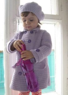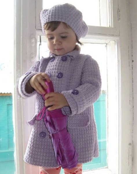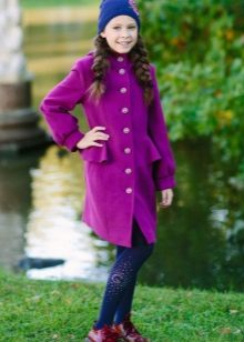 The charming coat of deep purple color is decorated with a large, beautiful flower. The image harmoniously completes the cute beret in tone coat.