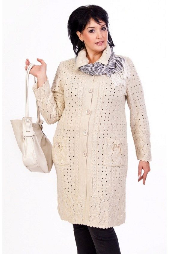 - Knitted coat. It’s not often possible to find such things in stores, but it’s worth your attention because it looks very impressive. Keep in mind that Aranova mating, so beloved by all the fashionistas recently, will add you an undesirable volume. But the vertical patterns and small uniform knitting will suit everyone without exception.