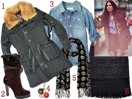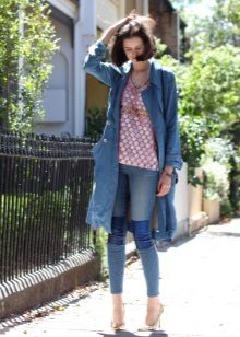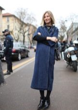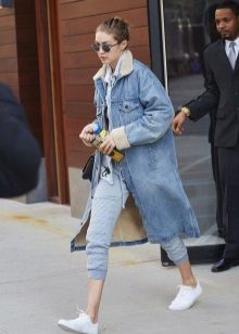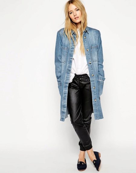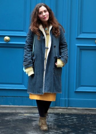 If you have to deal with the variants of a denim coat, then you should not wear it with very warm and thick clothes. One of the ideal options is an elongated thin wool or cotton sweater. To him need to pick insulated leggings with unusual patterns.