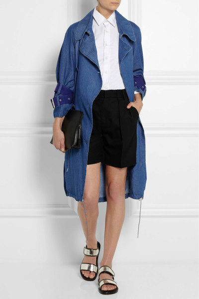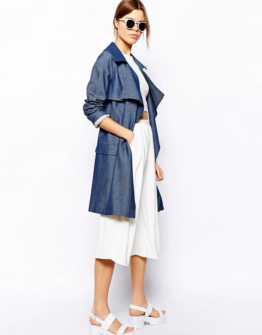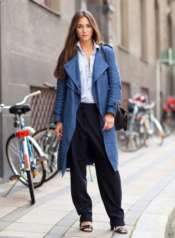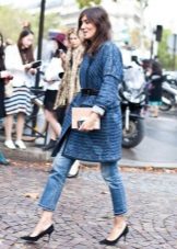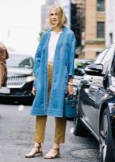 For a brighter look, you can add expressive sandals on a high platform or noticeable shoes with a steady heel to an image based on a denim coat. All of these options are suitable for coats, the length of which does not tend to maxi.