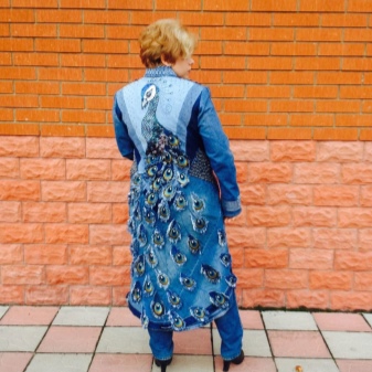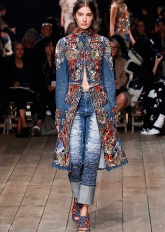 A denim coat can also be romantic if embroidered elements, patterns of beads, flounces, lace, sparkling decor, ruffles and other cute things were used as its jewelry. Under such models it is best to wear skirts, the style of which will depend on the design of the coat.
