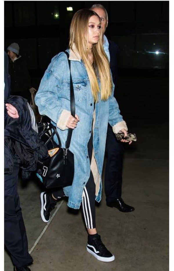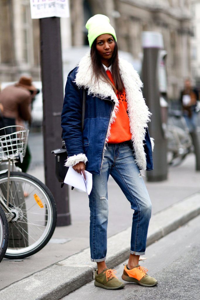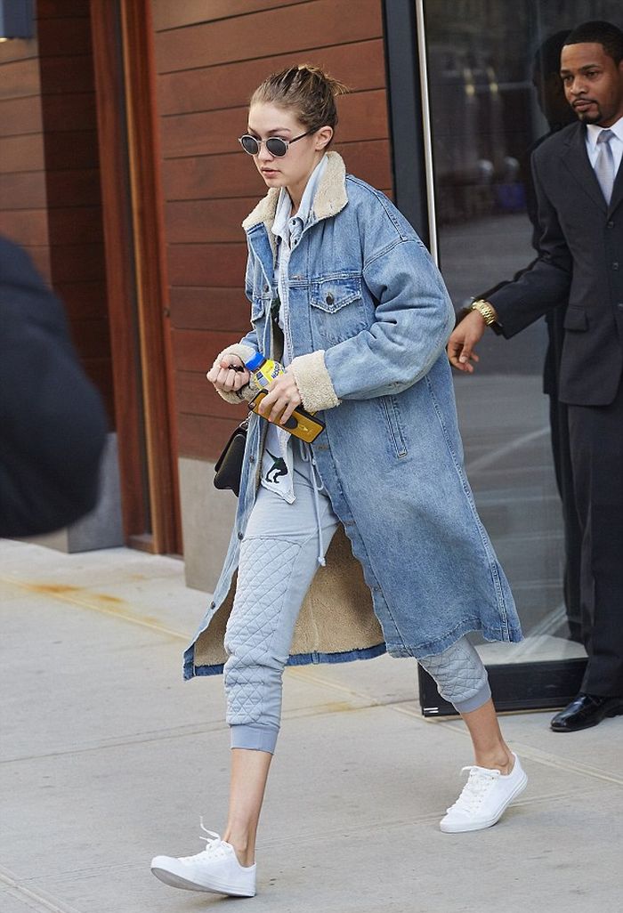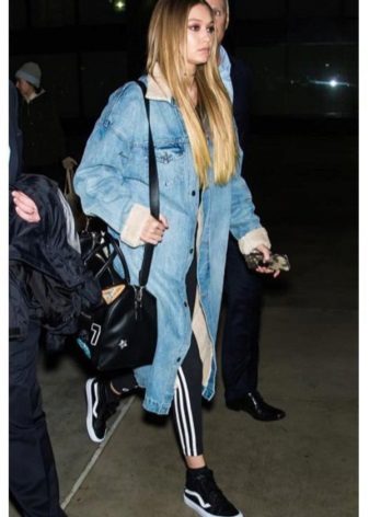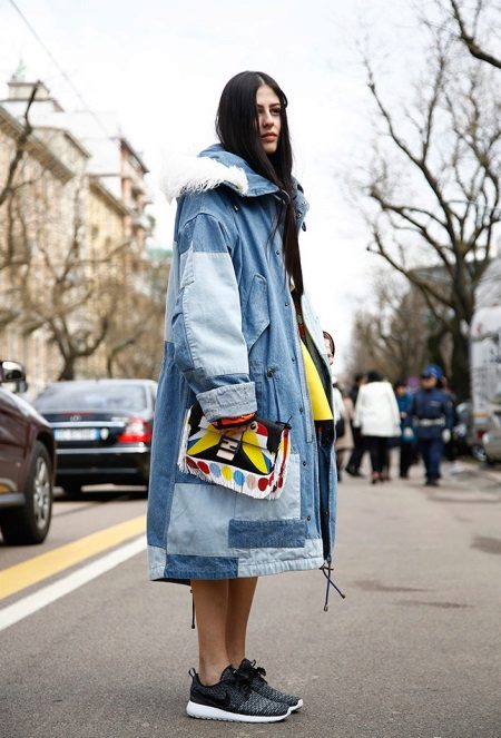 Even a sporty style can be formed using a denim coat, to which you will need to pick up trousers, for example, from knitwear, a sports sweater or a sweatshirt, and, of course, sneakers.