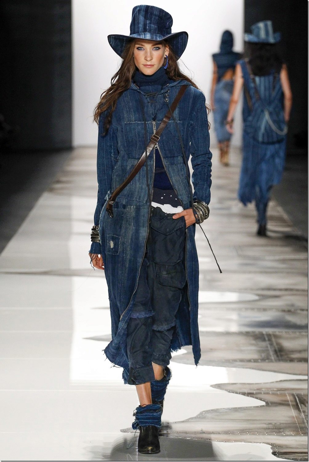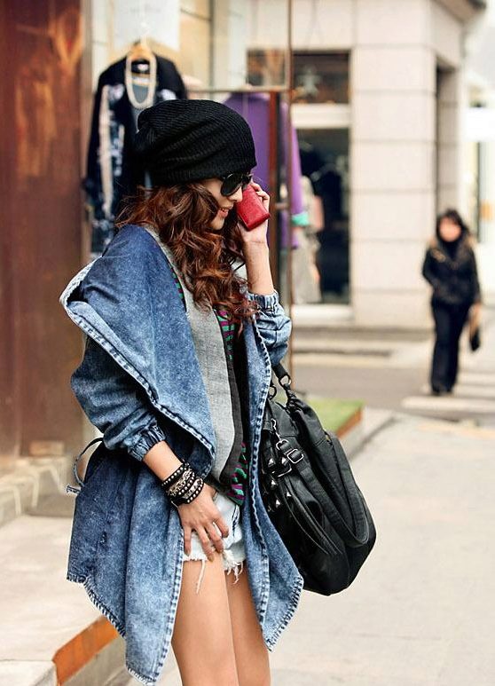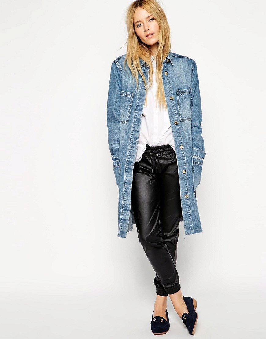 Denim coats can be worn with leggings. In this image, only not enough sweaters with a voluminous collar.