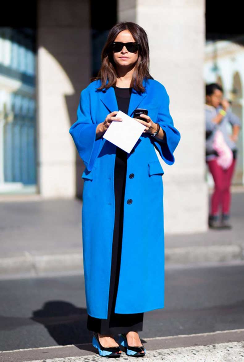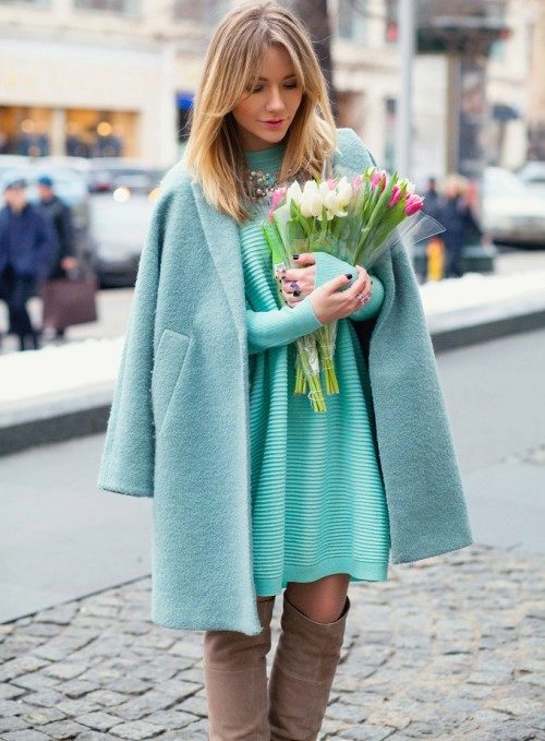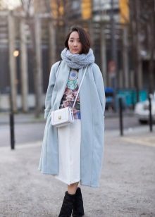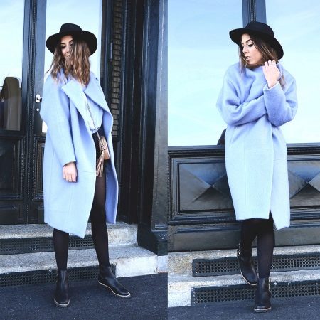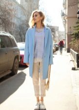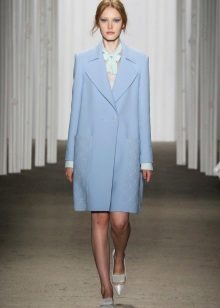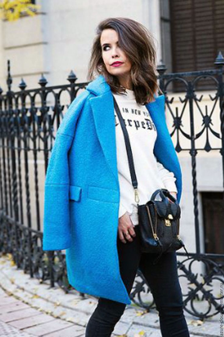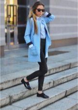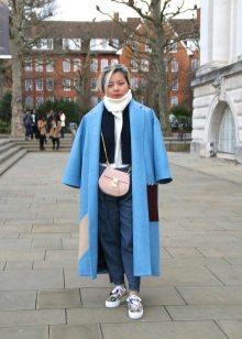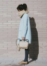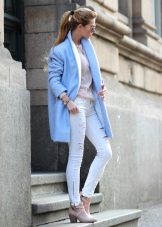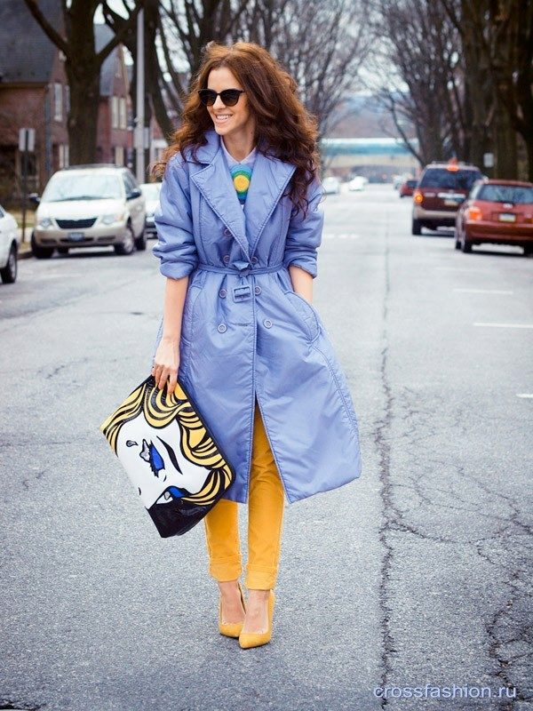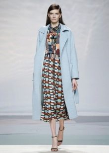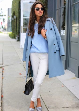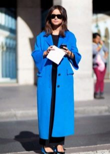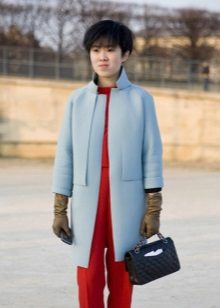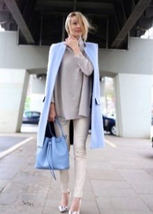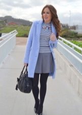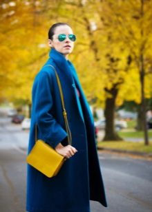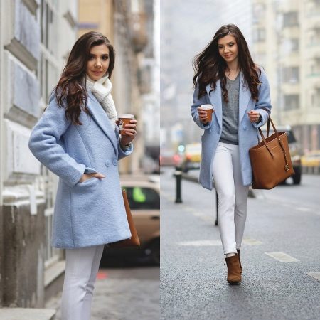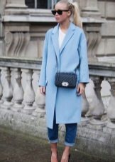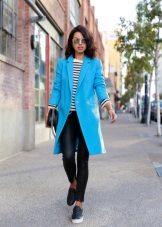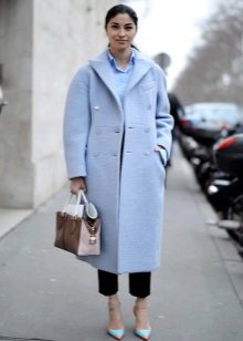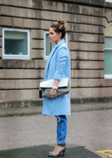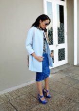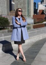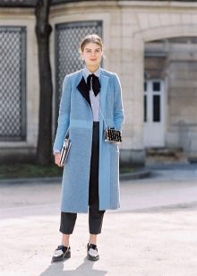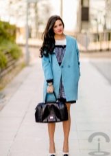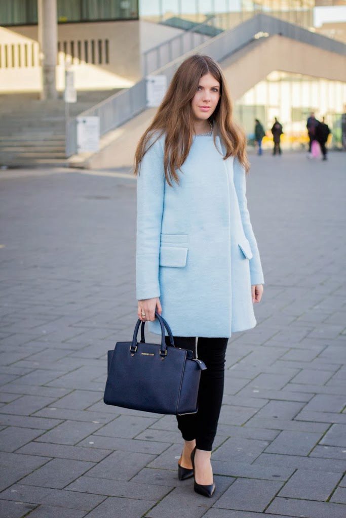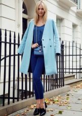 If you want to create a feminine romantic look, wear a blue coat with a dress or a skirt of pink, pale yellow or white. Complement the image with pumps on the hairpin and laconic clutch.