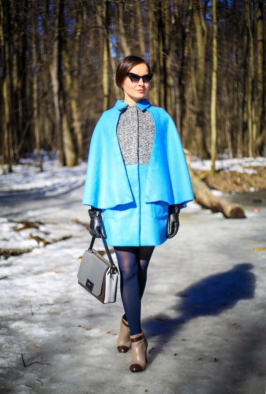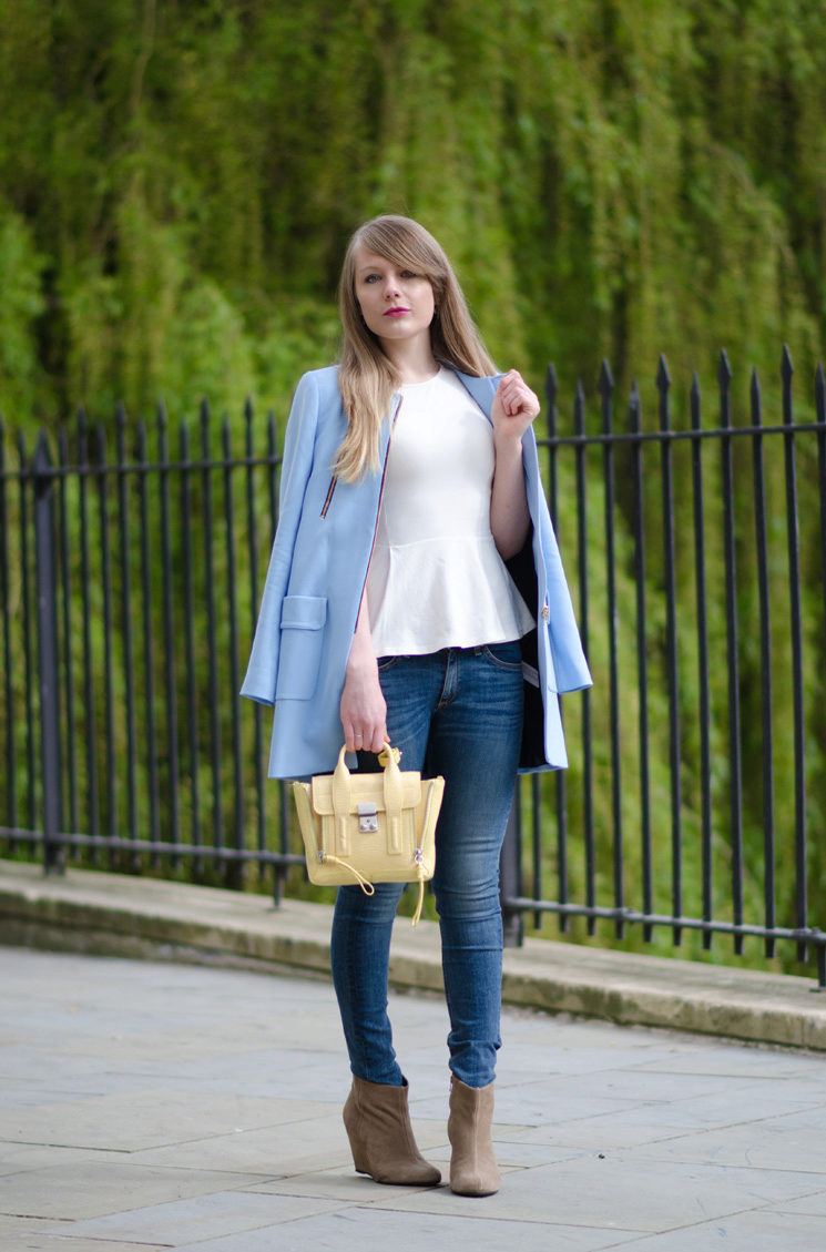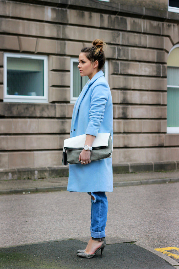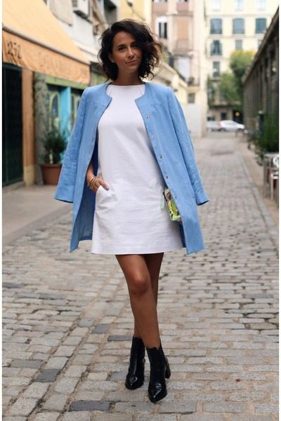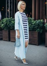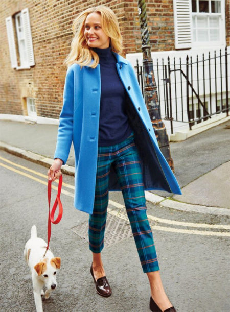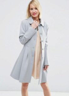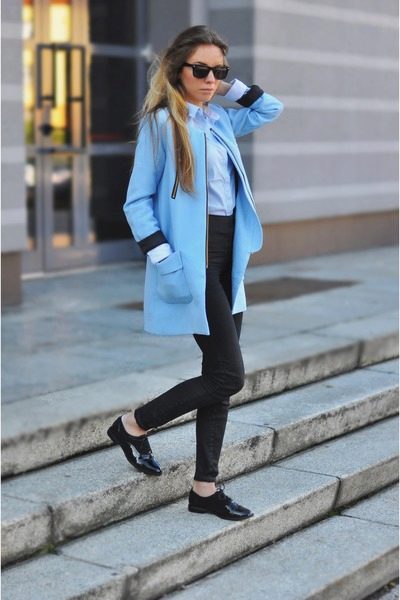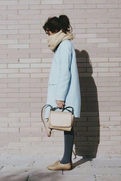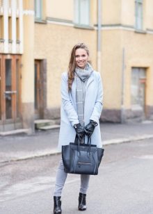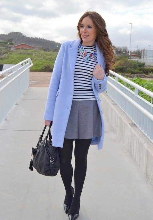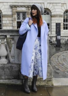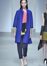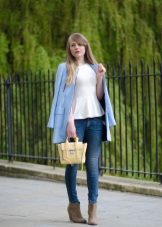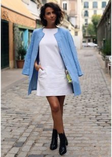 If you want to create a feminine romantic look, wear a blue coat with a dress or a skirt of pink, pale yellow or white. Complement the image with pumps on the hairpin and laconic clutch.
