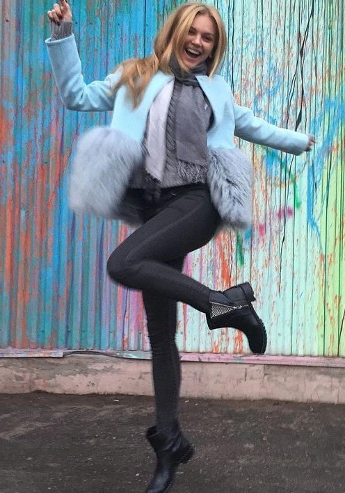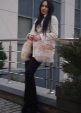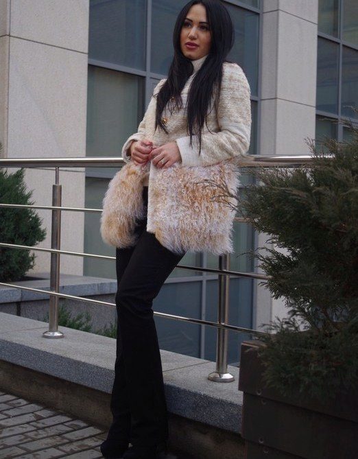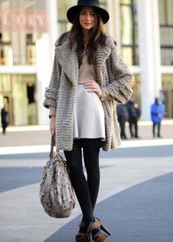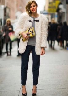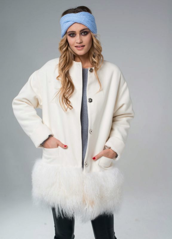 A white cashmere coat over the hem is decorated with a wide stripe of llama fur. Such fur inserts in clothes belong to fashion trends. The milky color of the product is in harmony with a gray sweater and a blue knitted headband. This creates a very feminine image, which is completed by tight pants and high leather boots.