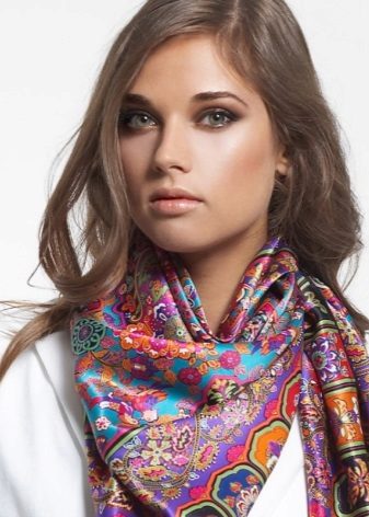 Very original solutions can offer a scarf, used as a scarf. Given that the scarf is usually square, fold it in half to get a triangle, then roll it into a roll (simple or twisted) and tie it around the neck with a simple knot, leaving, at your discretion, the ends on the chest, on the back or even on one shoulder on both sides.