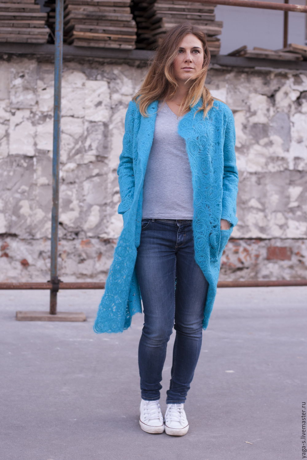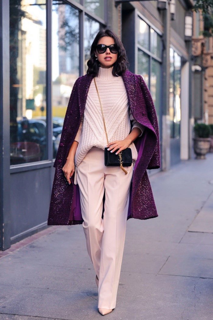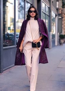 The knitted coat looks very elegant with the trousers, this outfit fits perfectly into a business and casual look. Shoes can be picked up with heels, preferring boats or ankle boots. Loafers or oxfords on a flat sole will also look nice. Various jewelry, shawls, sunglasses are welcome.