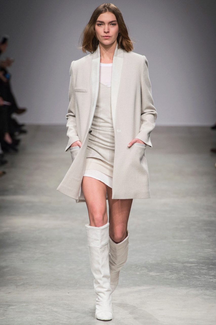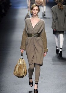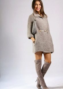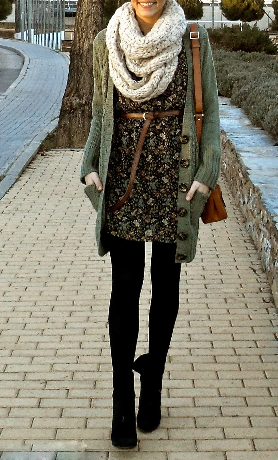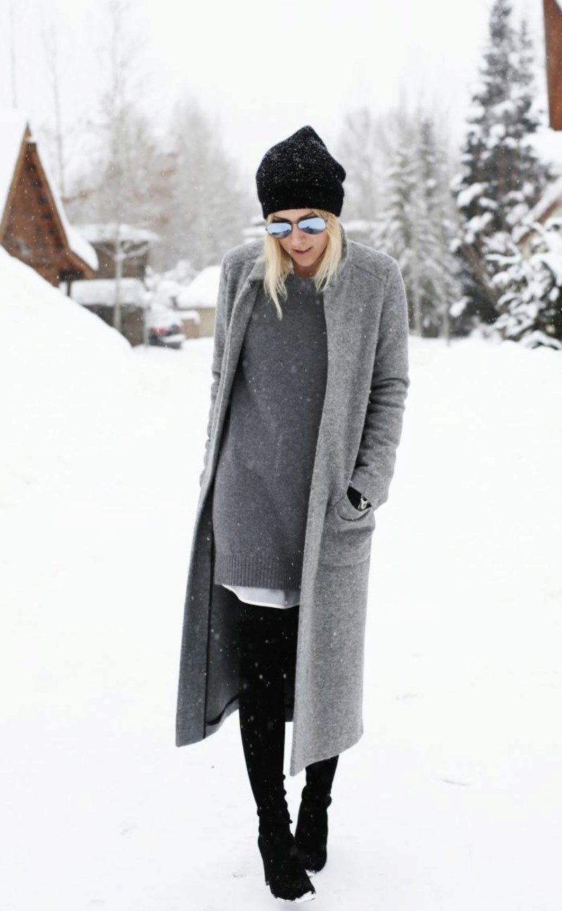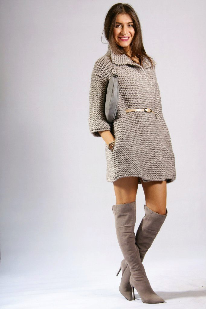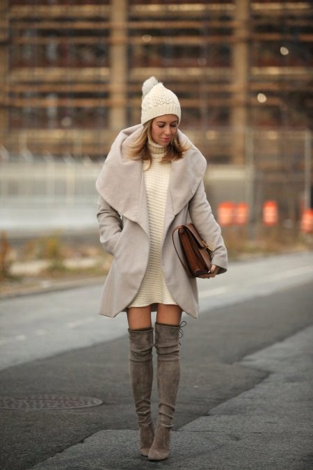 - This warm, cozy look in milky shades is perfect for dating back in the fall. A short knit dress in white, gray suede boots, a cardigan coat the color of coffee with milk. Look complemented by a brown bag and a white knitted hat with a pompon. Feminine, elegant and very cute!