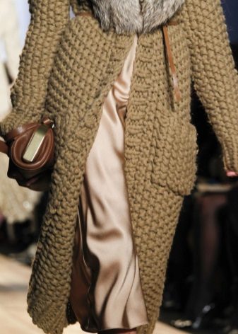 In the fashion are voluminous, slightly brutal cardigan coats, which necessarily serves as the basis of the image. Relevant volume knitting, coarse unpainted wool, leather inserts. Such products skillfully emphasize the fragility and refinement of its owner. It is not even necessary to say that long coats of rough knitting perfectly protect against cold, therefore they are suitable even for not very frosty winters.