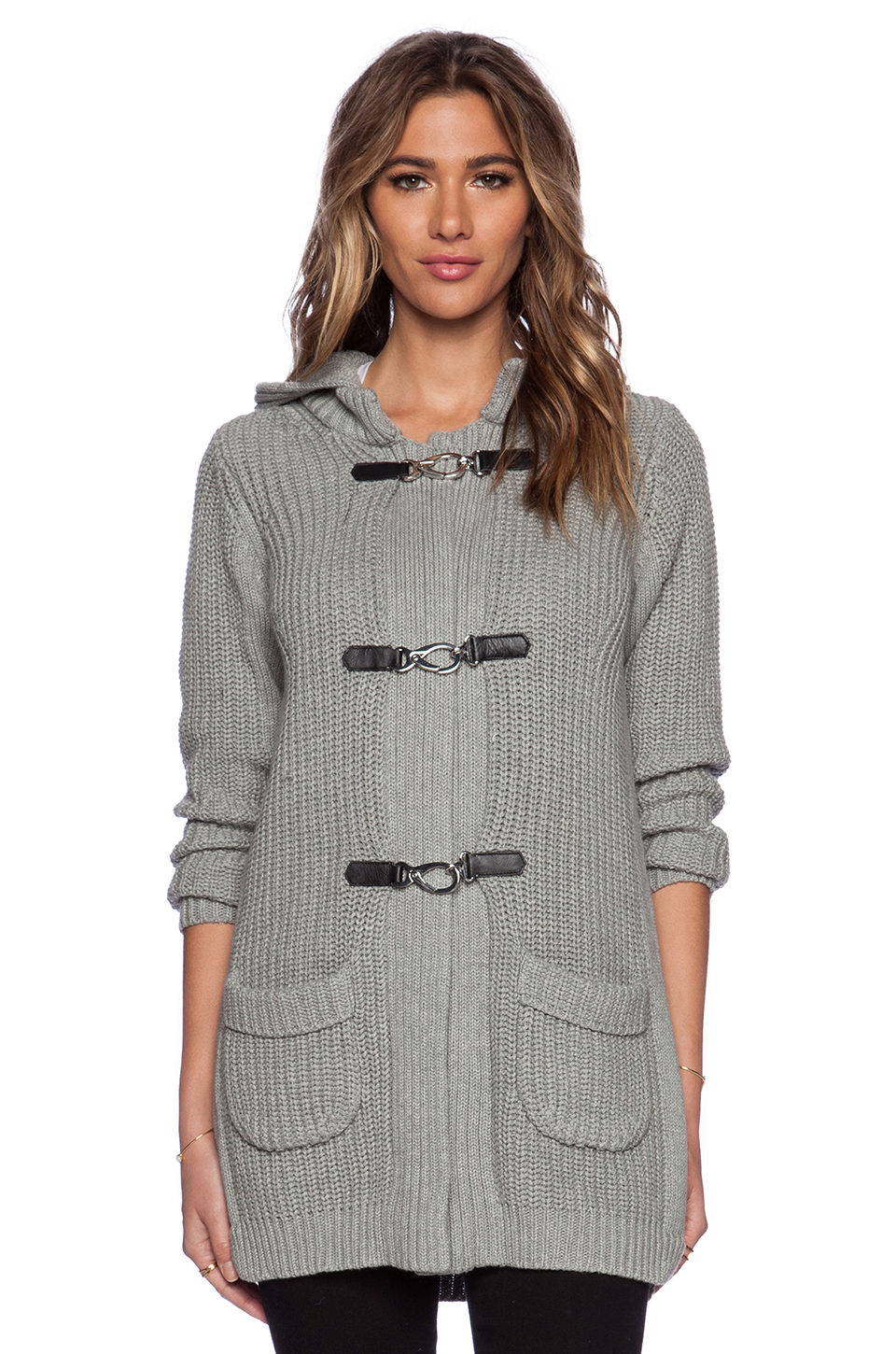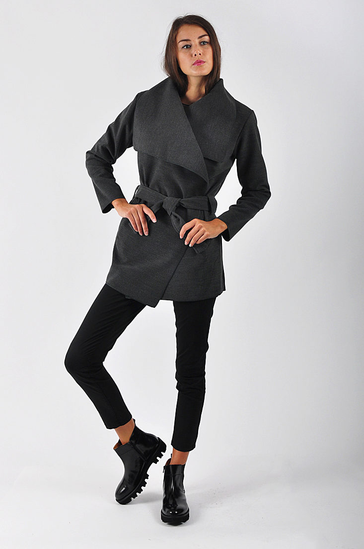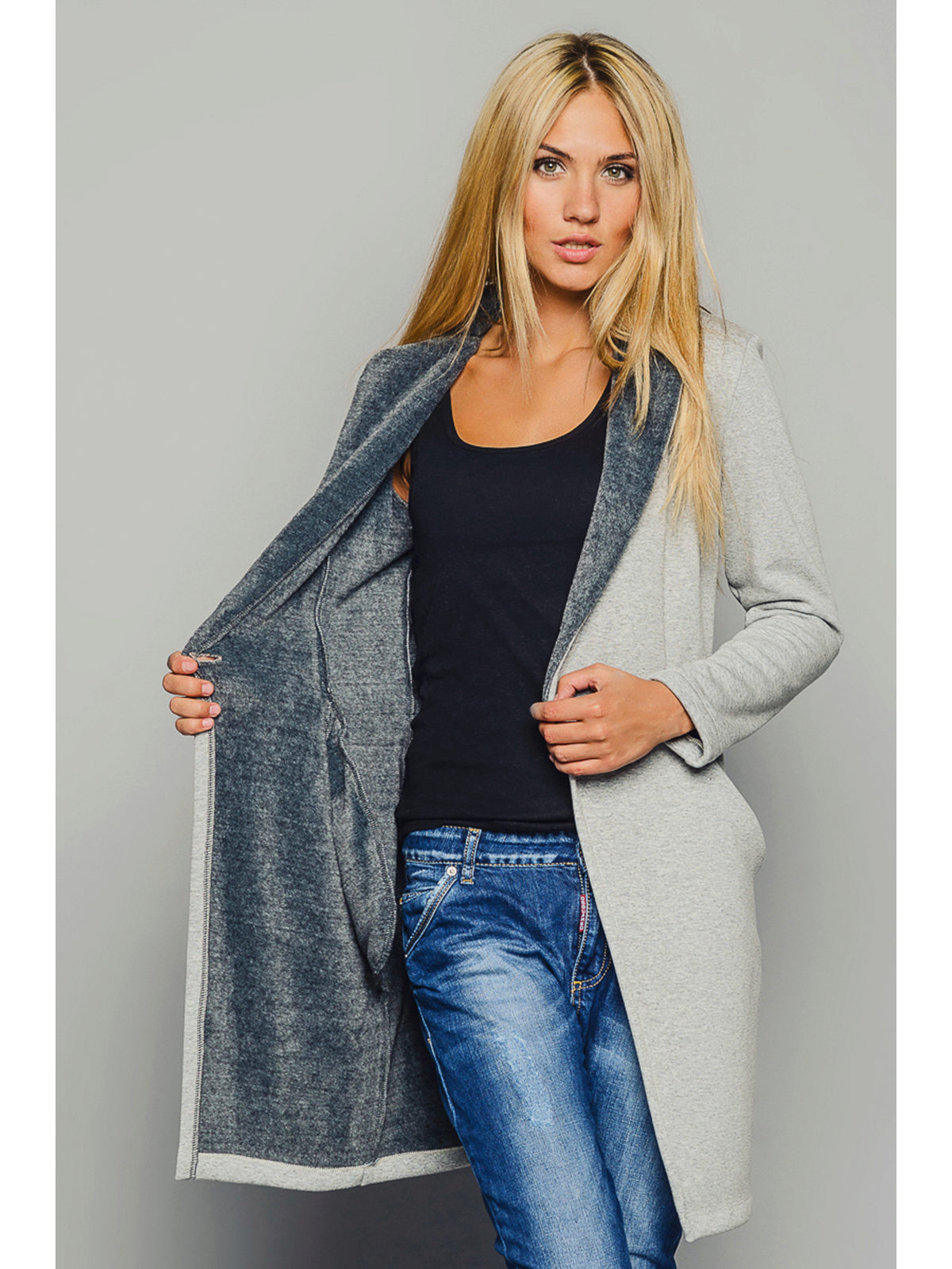 - A stylish knitted cardigan coat from gray melange will suit any fashionista.This is a fashionable model with a lowered shoulder, patch pockets and a contrasting edging that will easily complement any look. In this case, it is perfectly written off in a casual look: a blue denim shirt, black skinny jeans, khaki ballet flats and a brown belt strap. The image is complemented by a black handbag on a long belt and sunglasses.