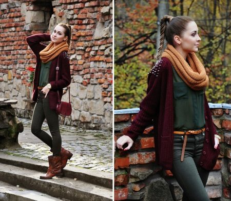 An important element of the autumn image is a scarf or shawl. It can be matched to the tone of a cardigan or choose a bright unusual product with a beautiful print. Geometric designs, animalistic and floral motifs are popular.