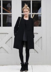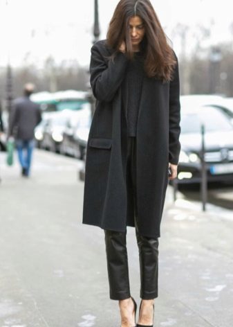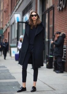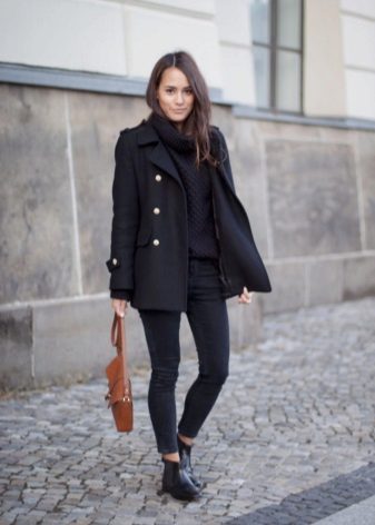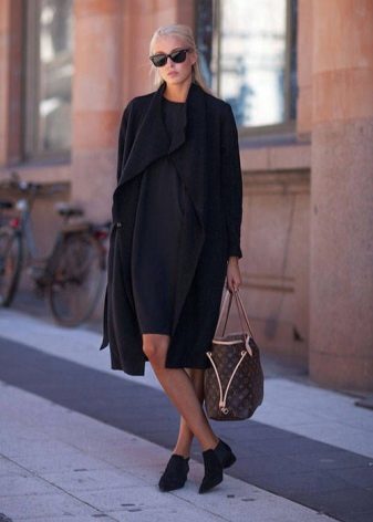 A completely new model appeared in the ranks of classic outerwear, which immediately aroused interest among women. Black color, thick jersey, no collar, which allows you to change the image with scarves, replacing buttons with buttons and three-quarter sleeves. This is a completely new look for a classic coat.