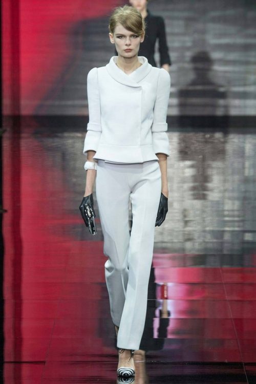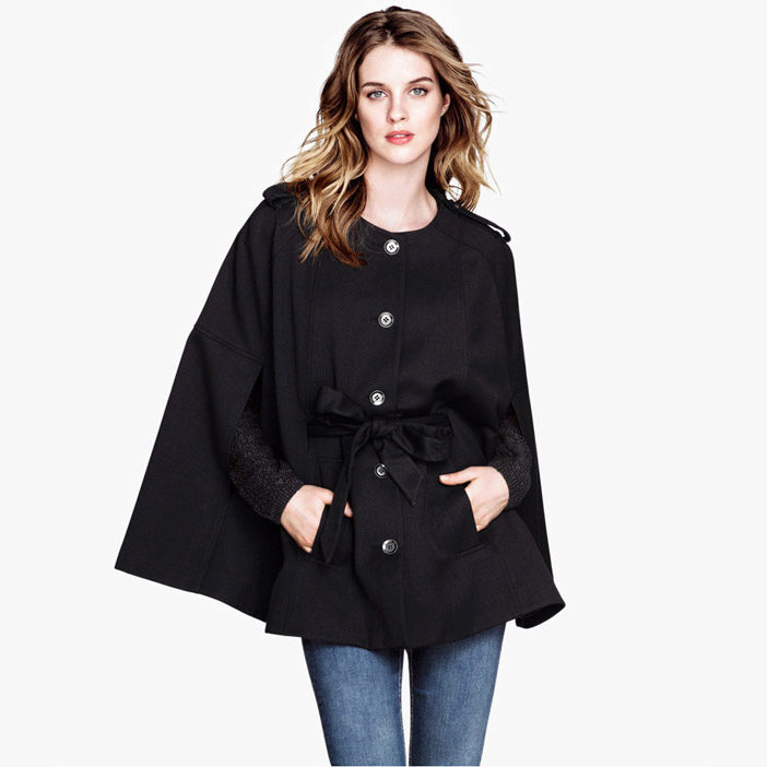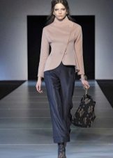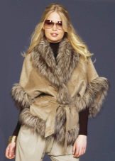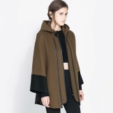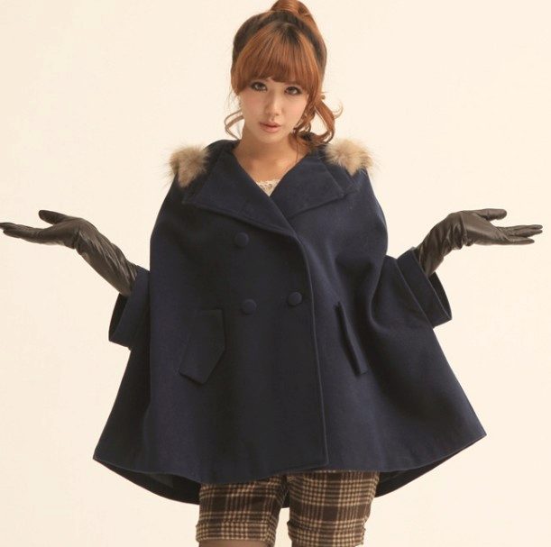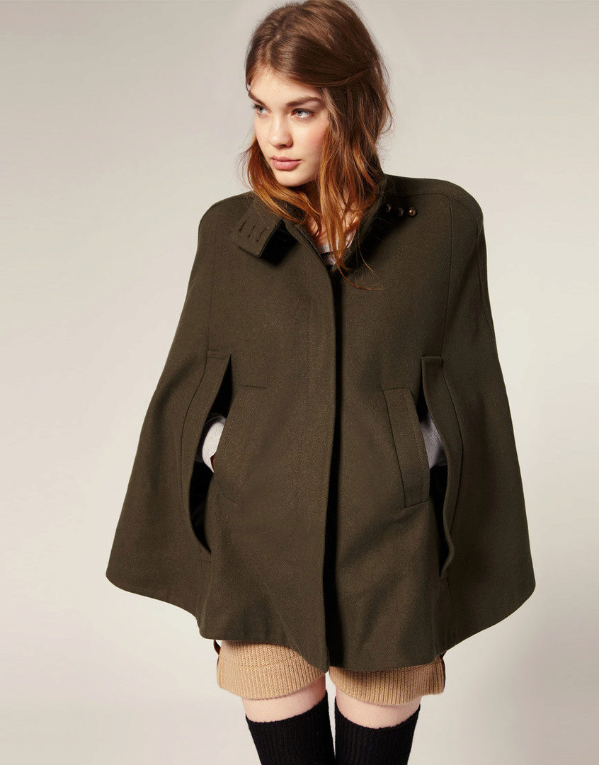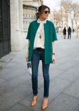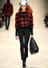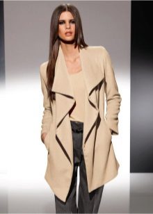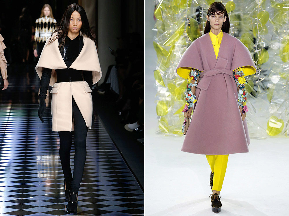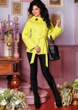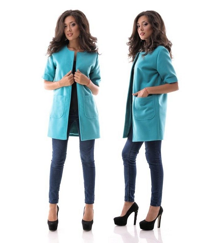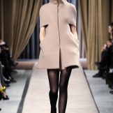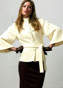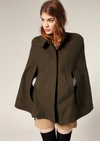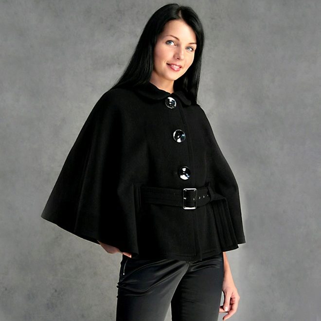Another popular style of a cropped coat is the cape or cape coat. Precise fit over the shoulders of this model is provided by sleeves of the raglan style and shoulder pads of varying degrees of thickness. A neat fold-over collar or miniature stand-up collar continues the expressive shoulder line. The sleeves of such clothing are either absent altogether, or instead of them there are narrow slits. Recently, models with very wide flared, very short sleeves have also appeared.