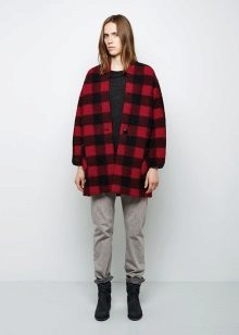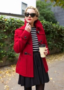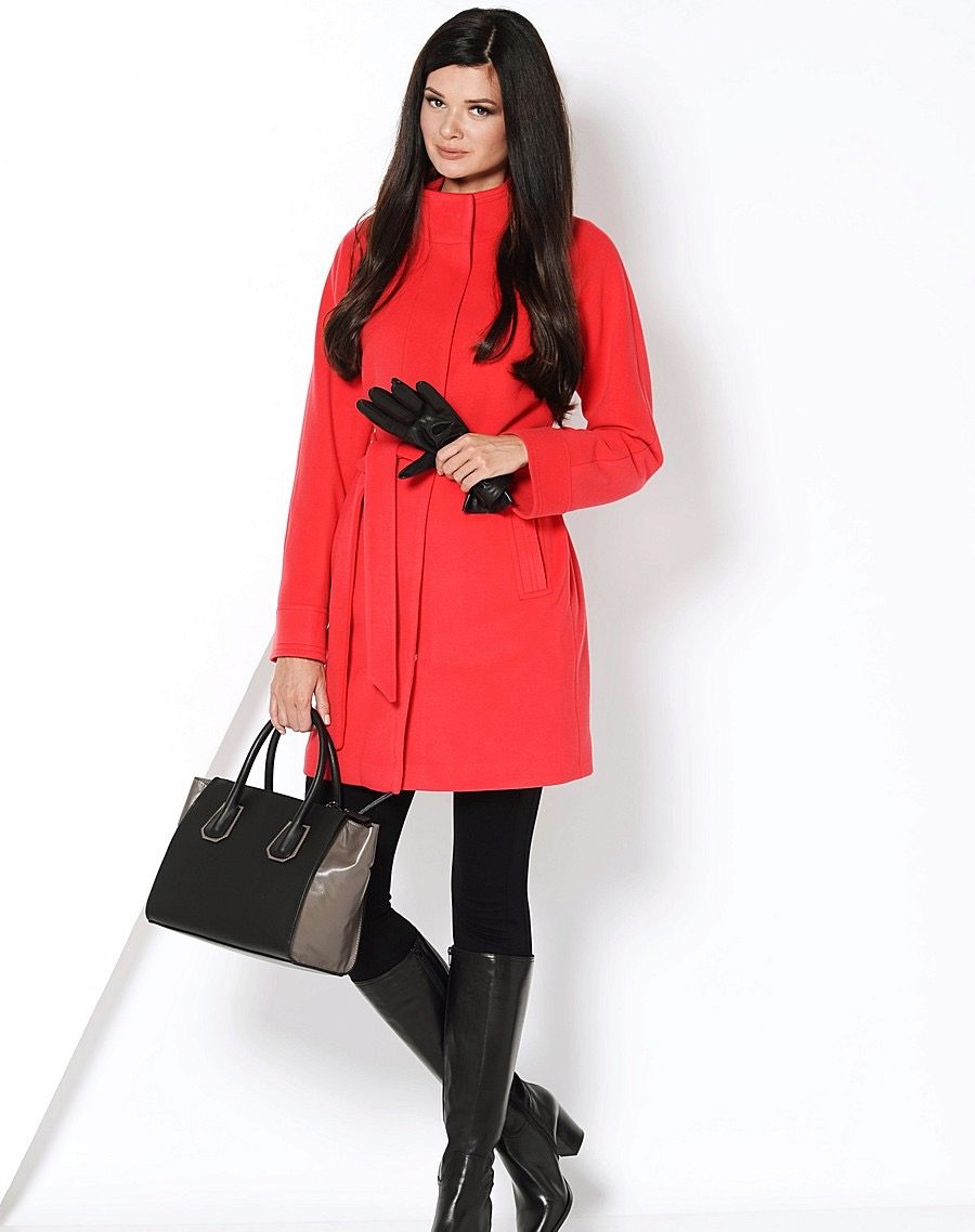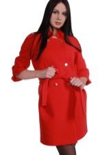 Today, a red coat of short length is in fashion, which can be both wide and slim. The model range is very diverse.