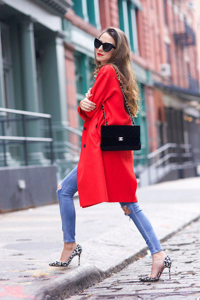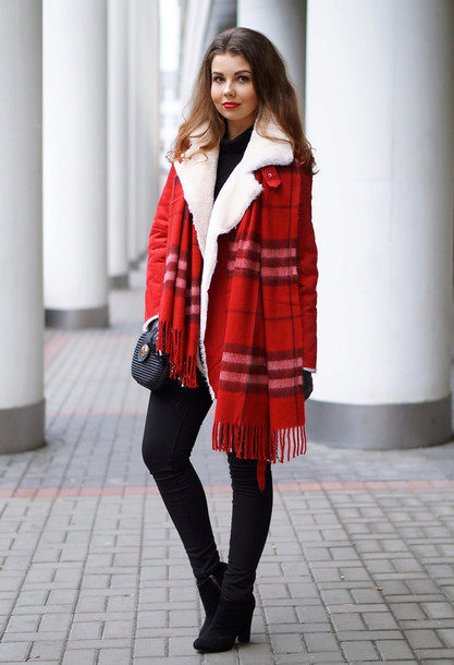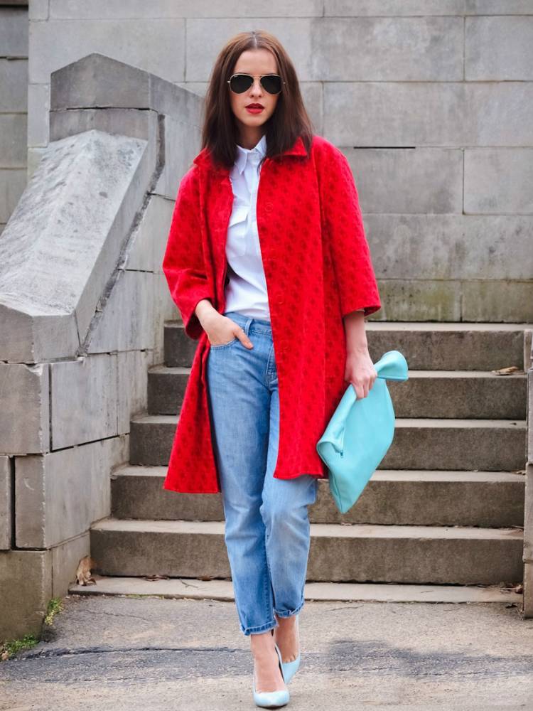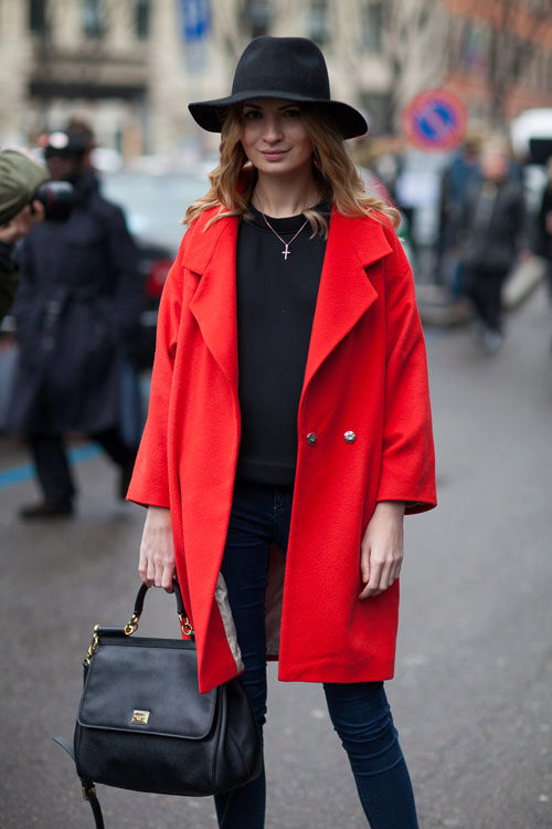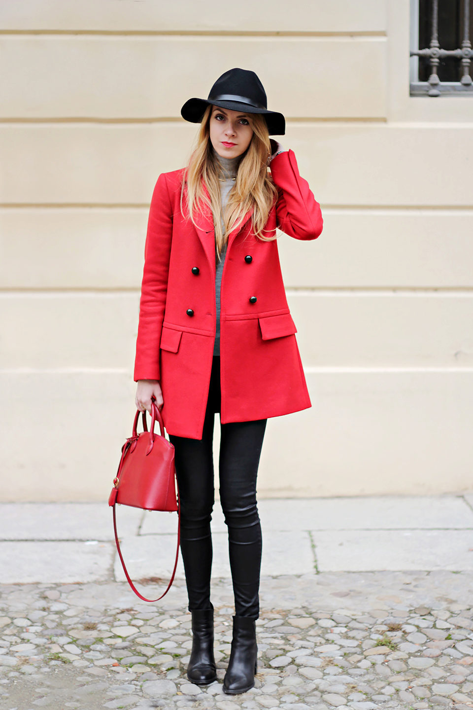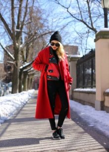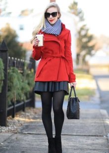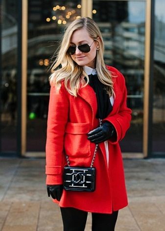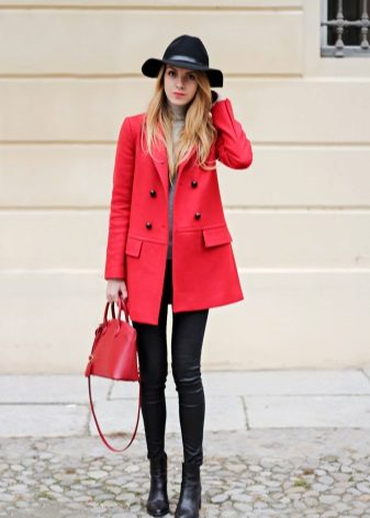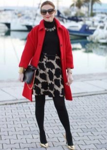 Red color looks great in a tandem with classic colors - black and white. The red coat can be combined with a bottom of blue, gray or brown. If you prefer clothes decorated with leopard print, then red outerwear will be the ideal option.