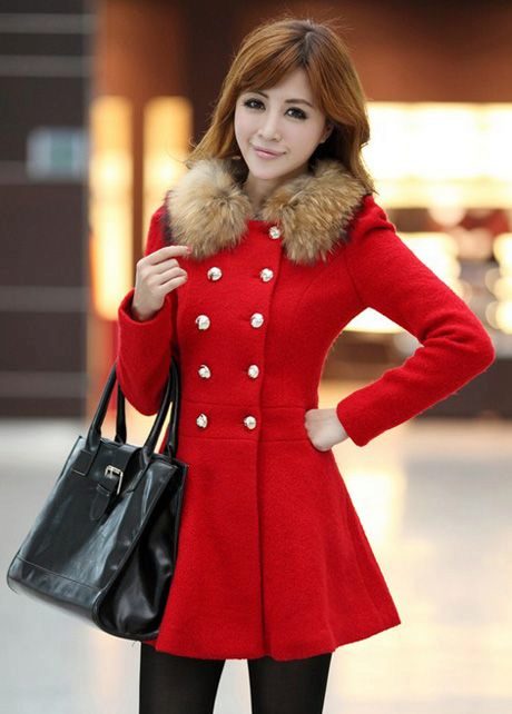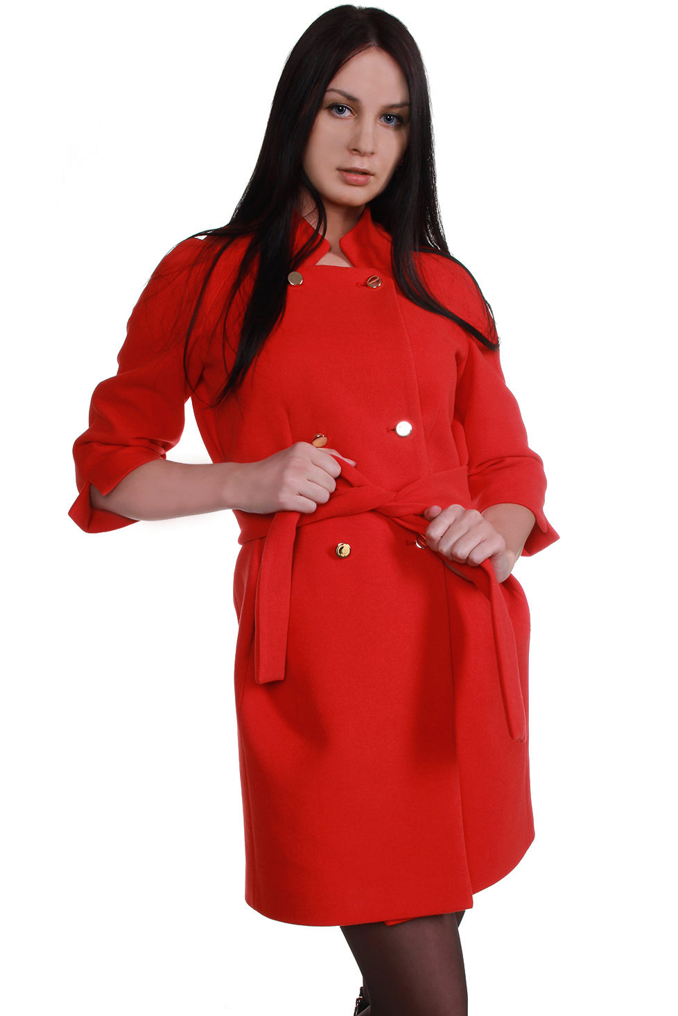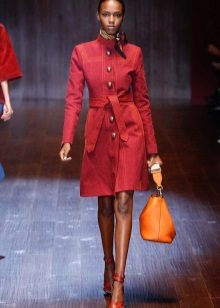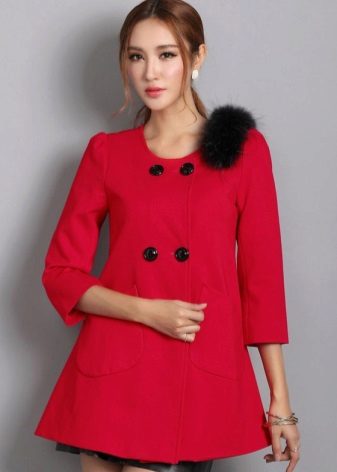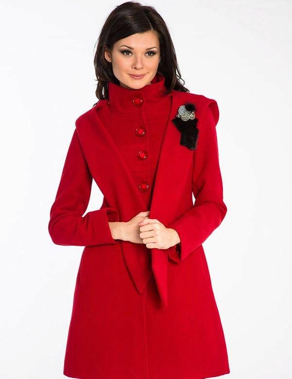 Many fashionable women prefer double-breasted models. The red coat with gold or black buttons looks beautiful and spectacular. A double-breasted A-neck coat with stand-up collar will add a femininity bow.