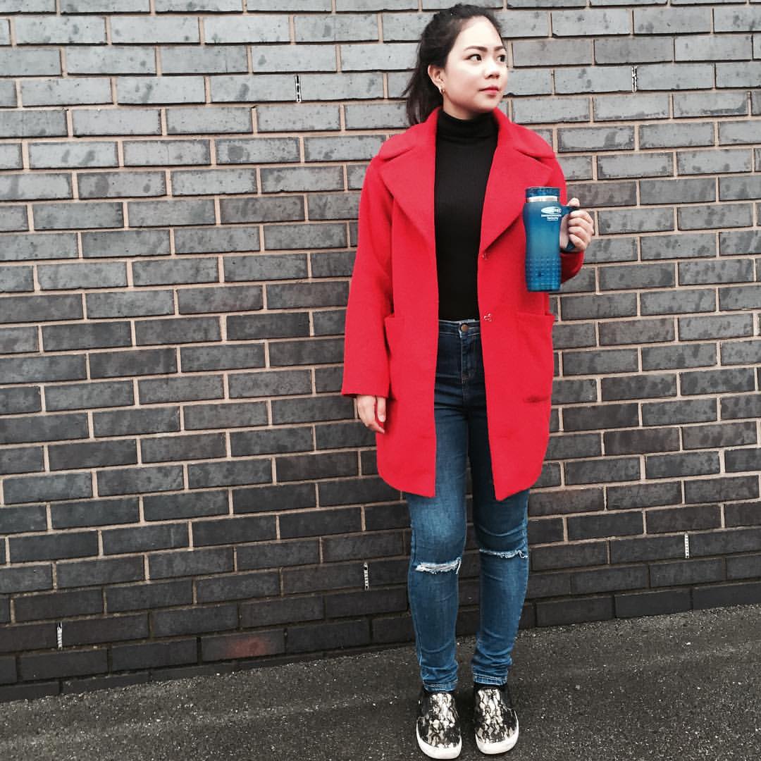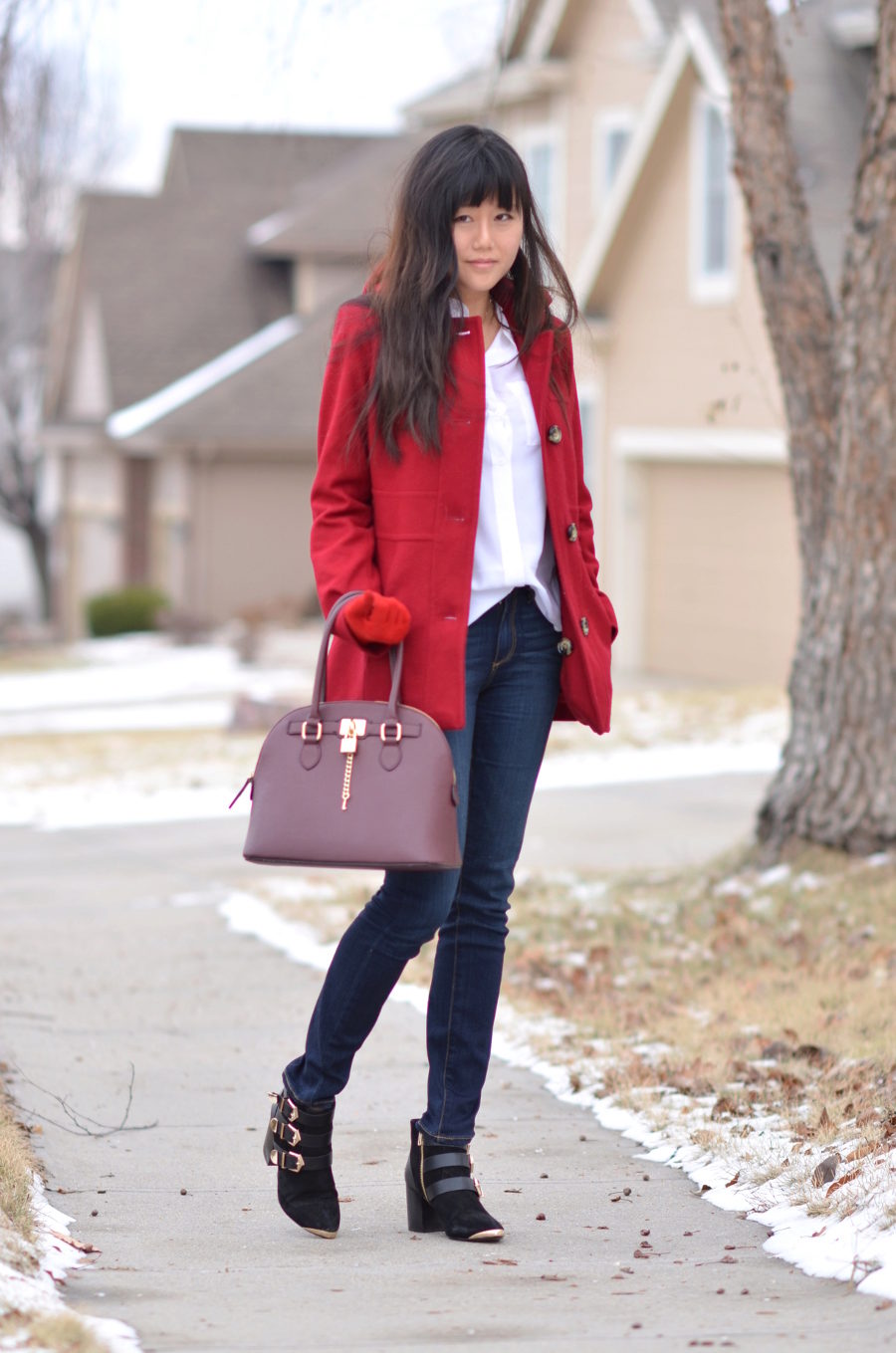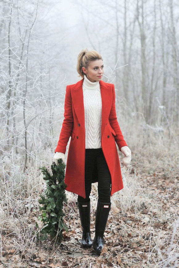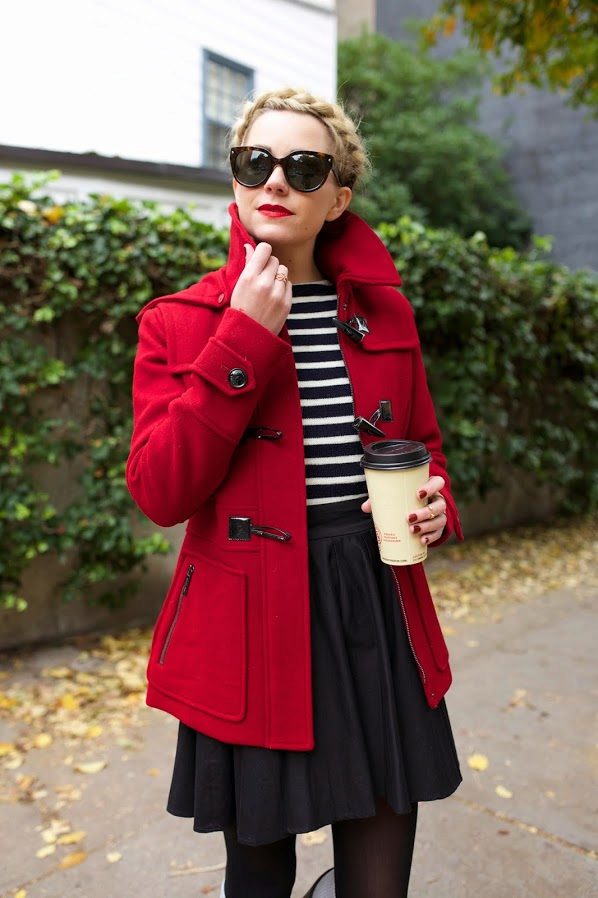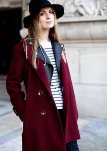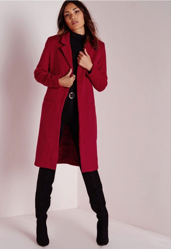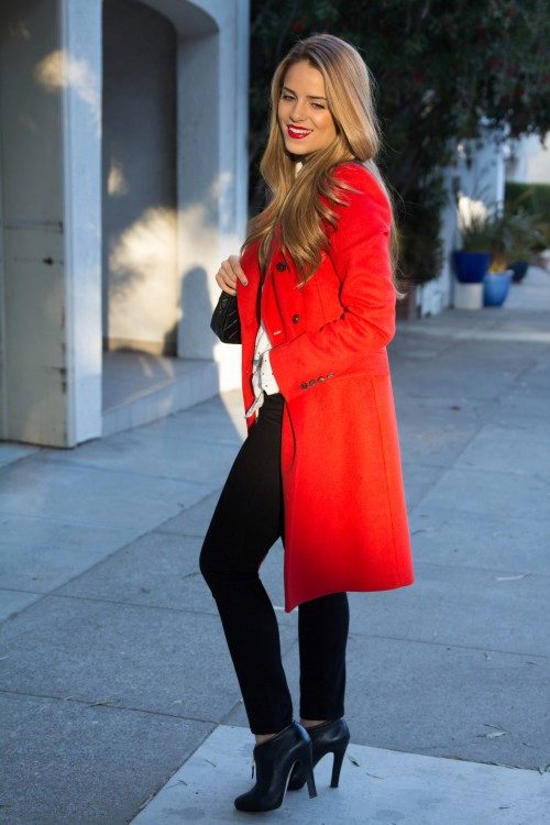 Dark red coat looks less bright than classic red. Women can afford it at any age. This shade gives the image of elegance, beauty and style.