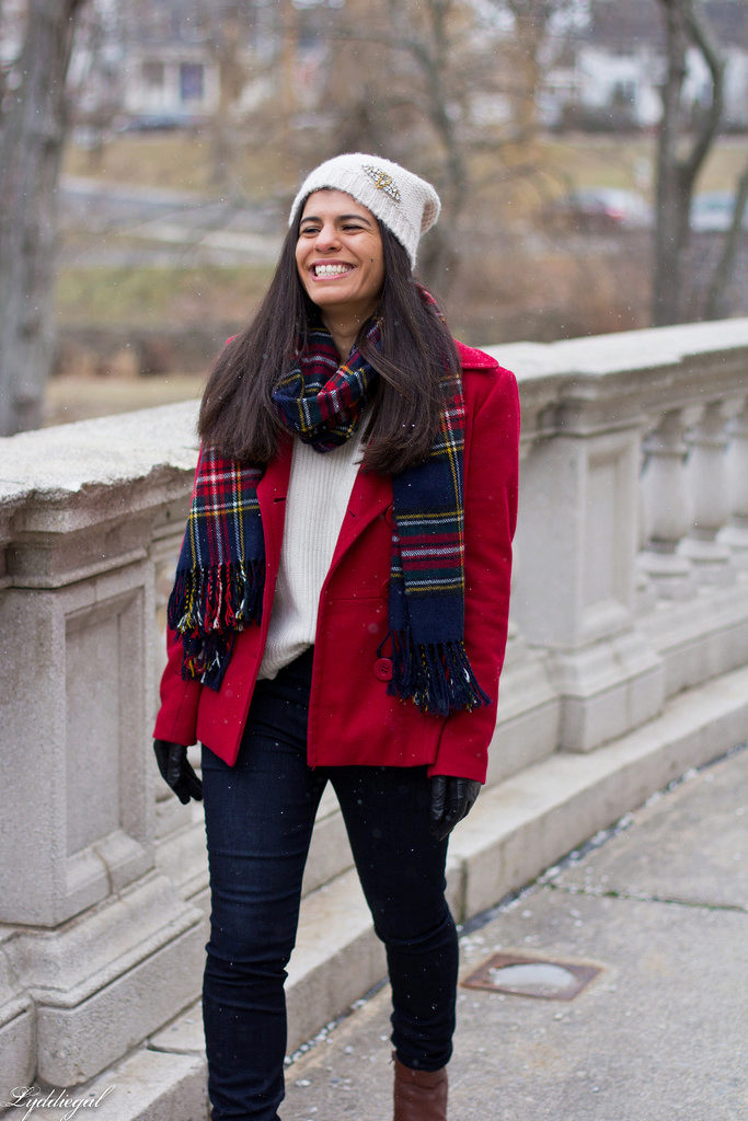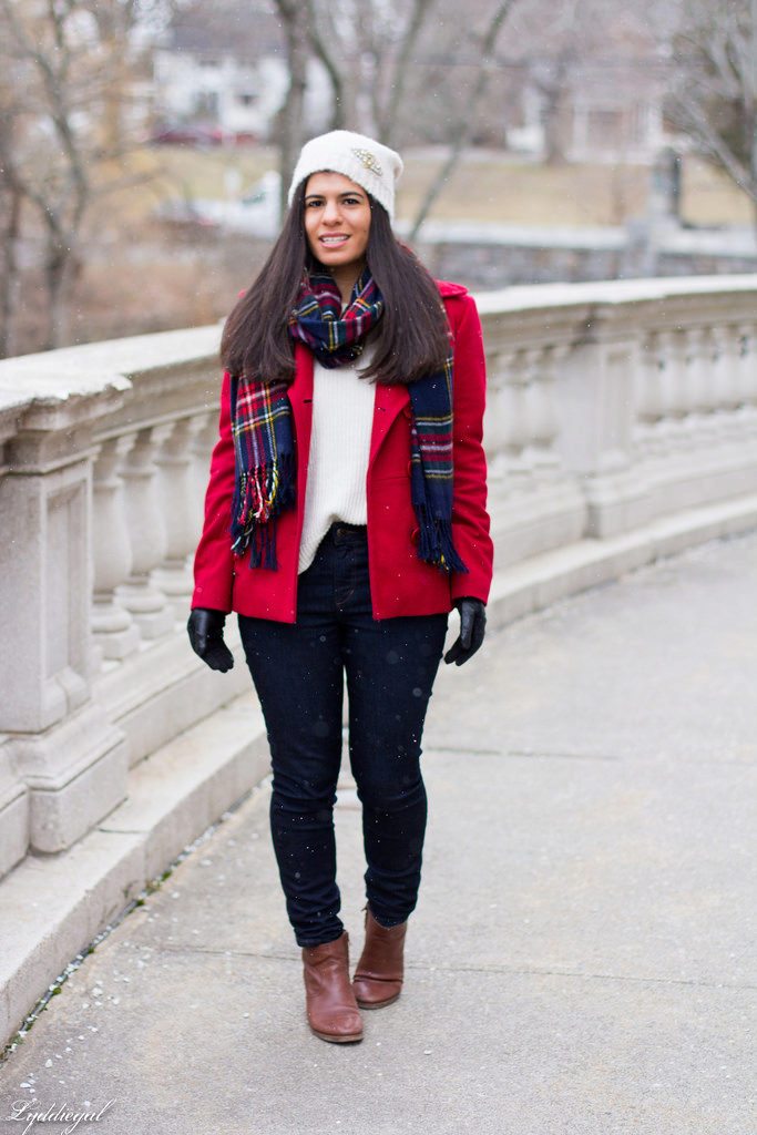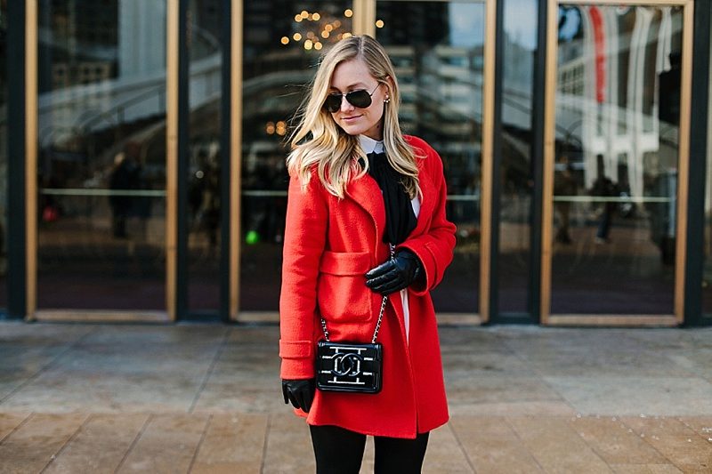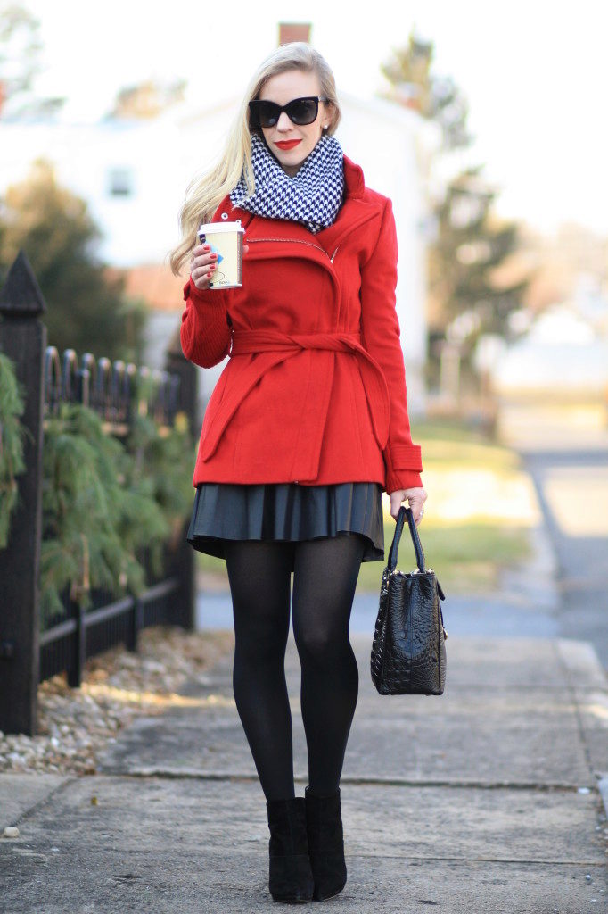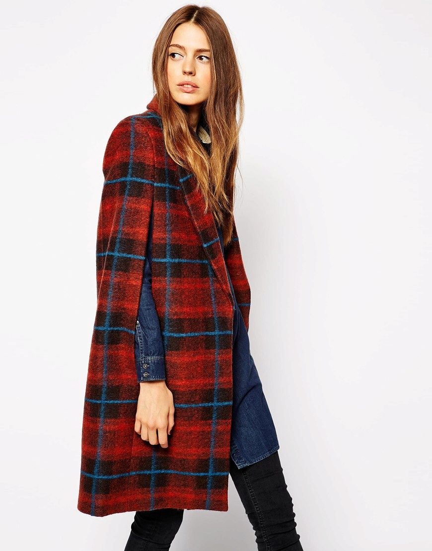 Dark red coat looks less bright than classic red. Women can afford it at any age. This shade gives the image of elegance, beauty and style.