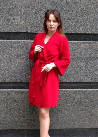 Among the short models in great demand is kimono, a distinctive feature of which is the smell, wide belt and free cut. Sometimes there is a French cut kimono. This model has a very wide collar, which can often be used as a hood.