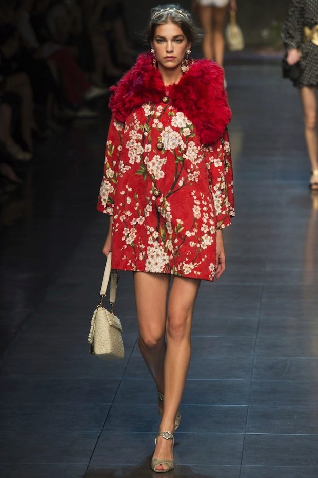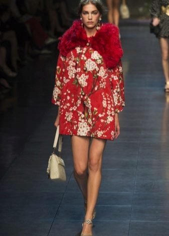 Against the background of red flowers look beautiful and elegant. Floral print will help add an image of femininity and brightness. Stylish looks red coat, decorated with black leopard print in the bottom.