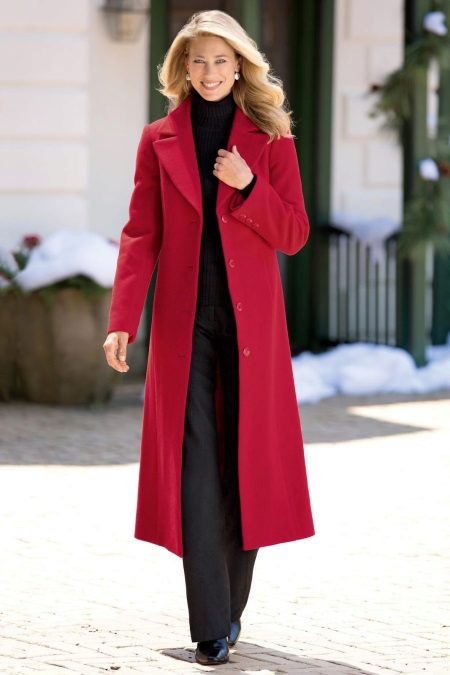 A long red coat allows you to lengthen the silhouette, give the image of mystery and attractiveness. Usually such a model is represented by a straight cut. A strict style is peculiar to many styles of a long coat of red color.