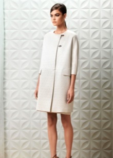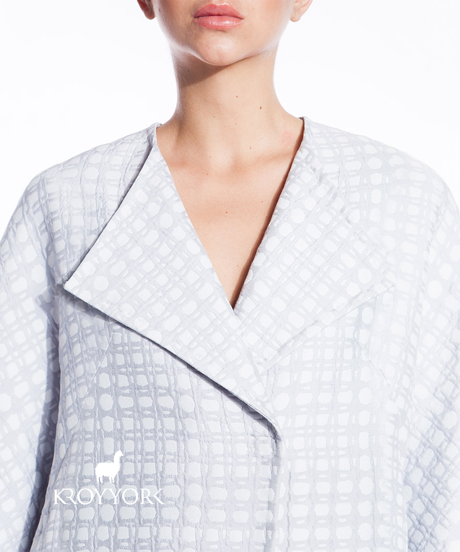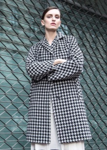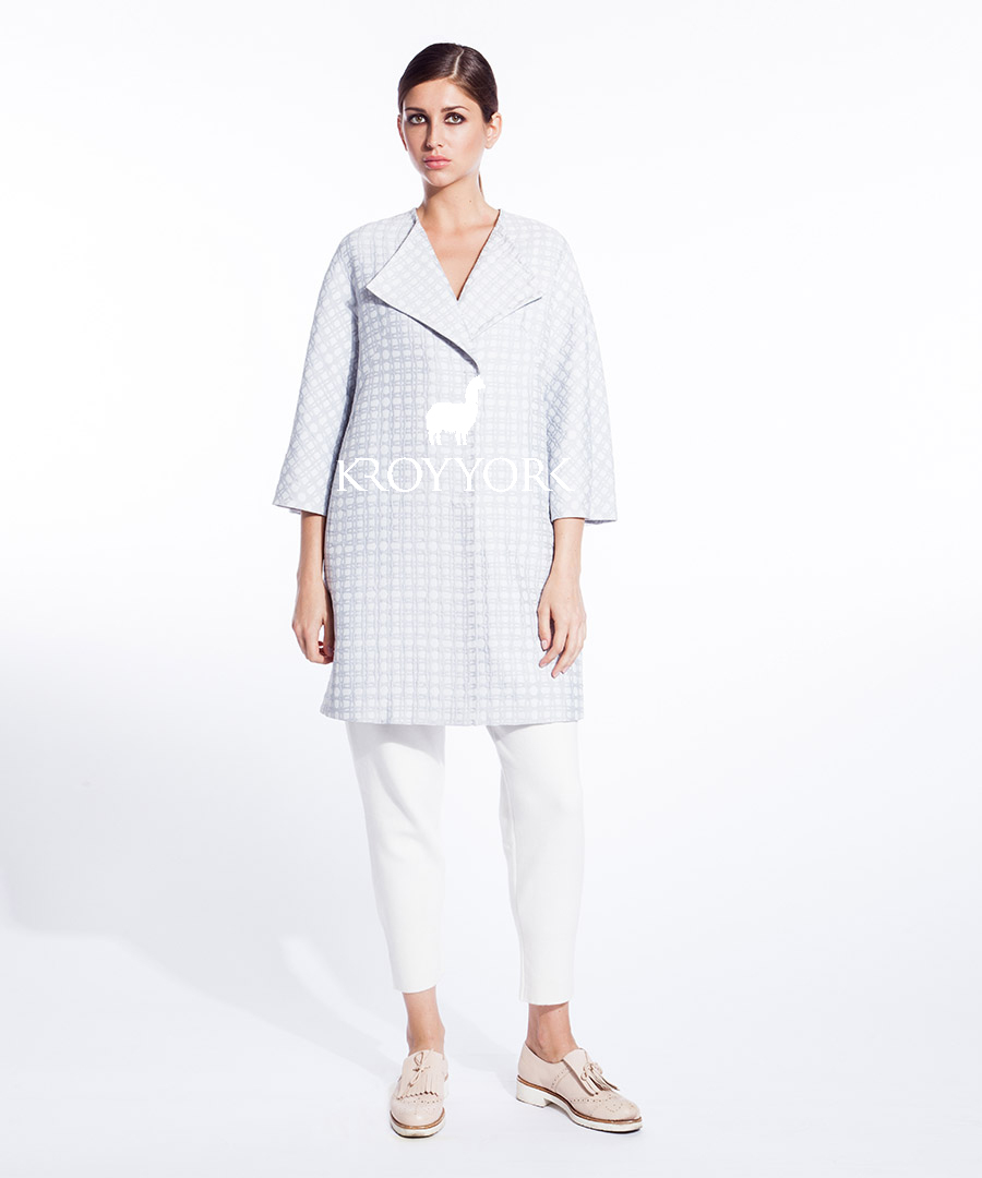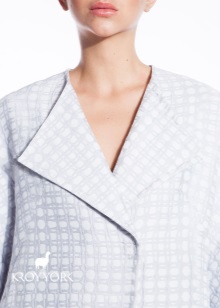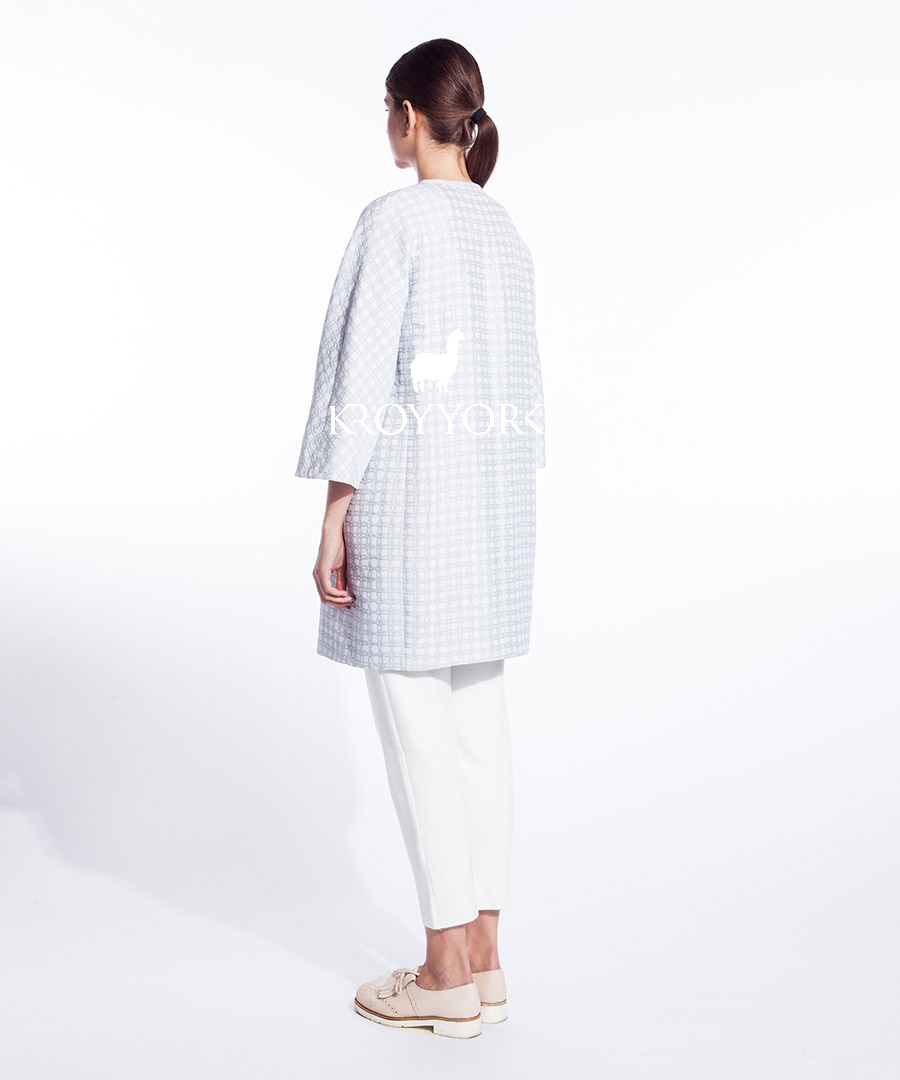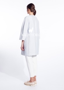 Amazingly gentle and light model for the late spring, will interest lovers of romantic images. The coat is made in white with a volume print of a modernized cell of a dull gray-blue color. The product is made of a lighter material, which consists of 40% cotton, 46% polyester and 14% flax. This combination makes the model practical, despite its light color, and resistant to dirt.