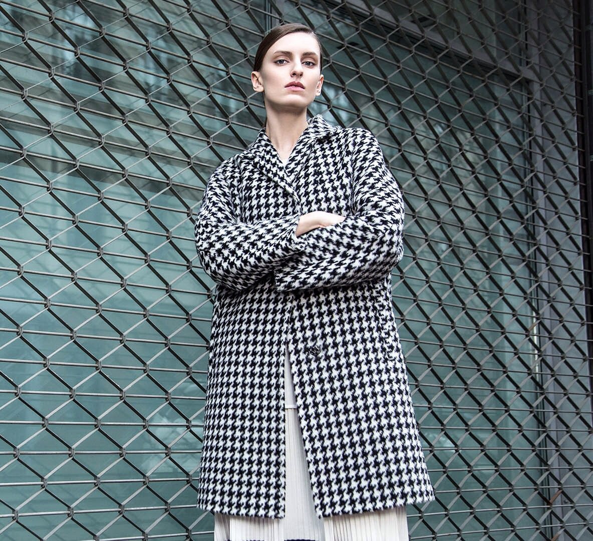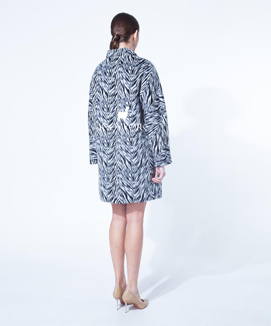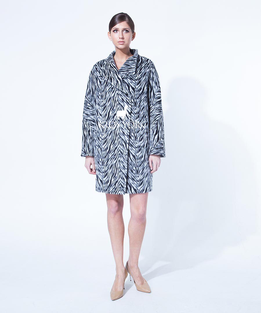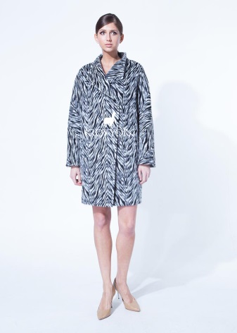 The design of the next model is more interesting, but at the same time not without traditional elegance, which is inherent in Kroyyork brand products. The coat has a trendy black and white print in an animal zebra style. The material in this case is made of 20% natural wool and 80% alpaca wool. The combination of this print with surprisingly soft to the touch and warm material makes the coat popular among women. In addition, there is a more practical, but no less stylish beige-black shade.