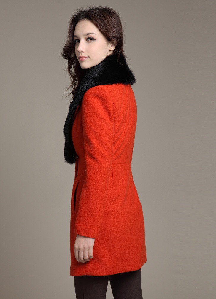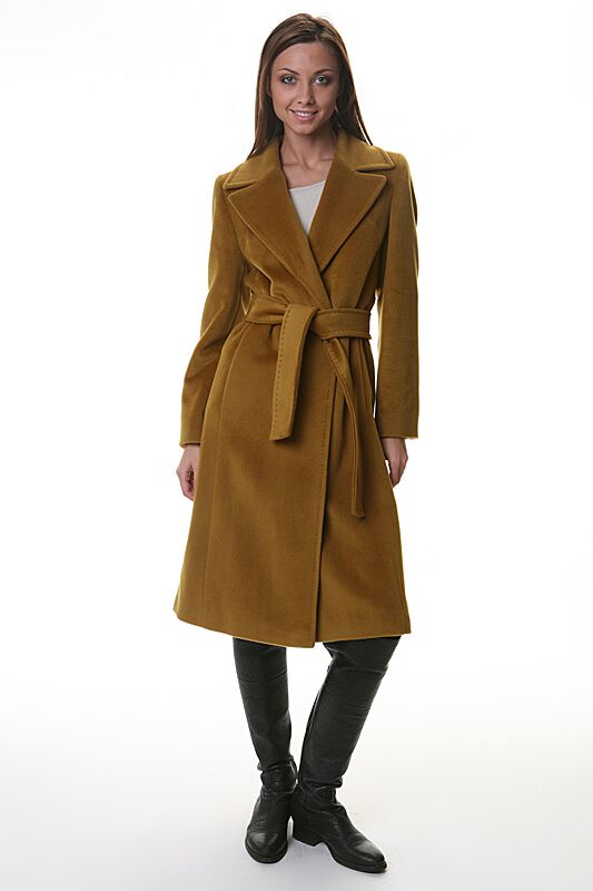 The advantage of this coat is its exceptional appearance. The turn-down volume collar looks extremely laconic and is able to emphasize the femininity of its owner in combination with a laconic belt and deep pockets. The material looks extremely luxurious and expensive, and also has a spectacular ability to give glare in the light. This product is also available in rich blue and black.