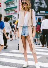 In everyday summer wardrobe there are no special restrictions. Summer coat will look good with a variety of dresses, tops and skirts, cropped pants, shorts, jeans. Sandals, shoes, sneakers will complement the image of the shoe. Stylish glasses, bracelets, and earrings are suitable as accessories.